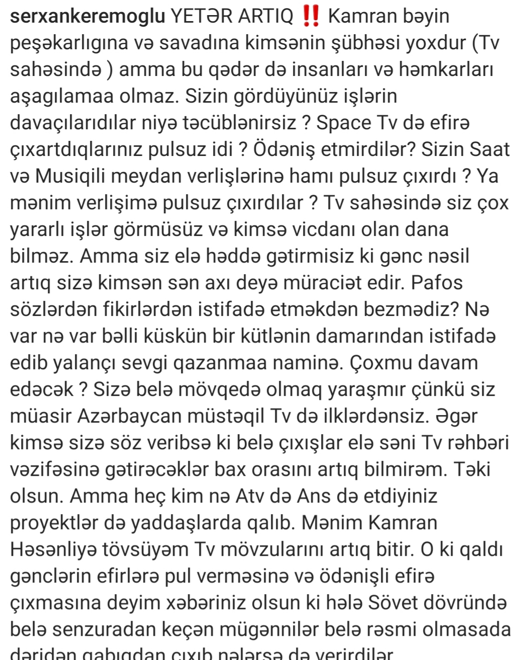 “Yetər artıq! Kamran bəyin televiziya sahəsində peşəkarlığına və savadına kimsənin şübhəsi yoxdur, amma bu qədər də insanları və həmkarları aşağılamaq olmaz. Sizin gördüyünüz işlərin davamçılarıdırlar, niyə təəccüblənirsiniz? “Space” telekanalında efirə çıxardıqlarınız pulsuz idi? Ödəniş etmirdilər? “Sizin saat” və “Musiqili meydan” verilişlərinə hamı pulsuz çıxırdı? Ya mənim verilişimə pulsuz çıxırdılar?