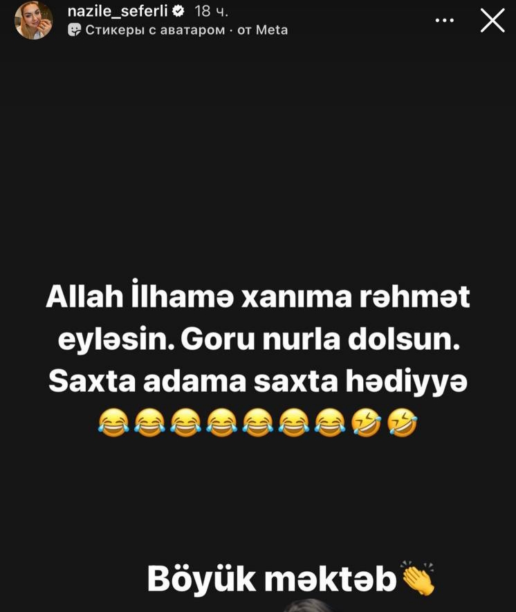 Teleqraf.com xəbər verir ki, Nazilə Səfərli İnstaqramda ad çəkmədən “Allah İlhamə xanıma rəhmət eləsin. Qəbri nurla dolsun. Saxta adama saxta hədiyyə. Böyük məktəb...”, - deyə bildirib.
