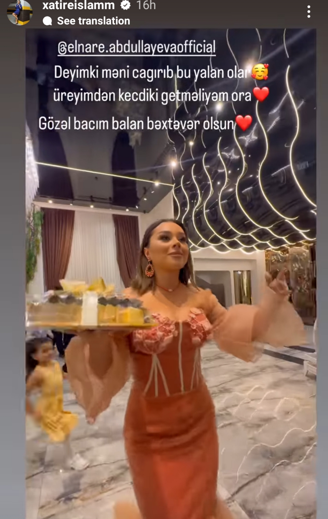 Teleqraf.com xəbər verir ki, Xatirə İslam bu haqda İnstaqramda hekayə bölümündə məlumat verib: "Deyim ki, məni çağırıb, bu yalan olar. Ürəyimdən keçdi ki, ora getməliyəm. Gözəl bacım, balan bəxtəvər olsun".