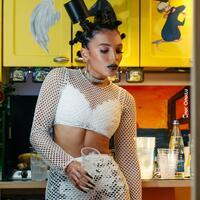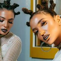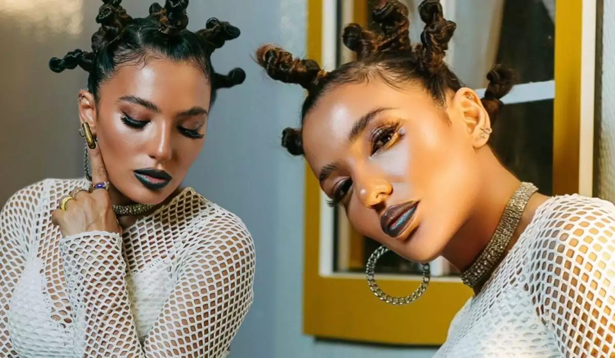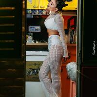 O, ağ, uzun, transparan libasını saç düzümü ilə tamamlayıb.