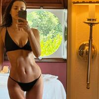 38 yaşlı model hotel otağında güzgü qarşısında poz verib. O, incə bədənini nümayiş etdirən qara bikini geyinib.