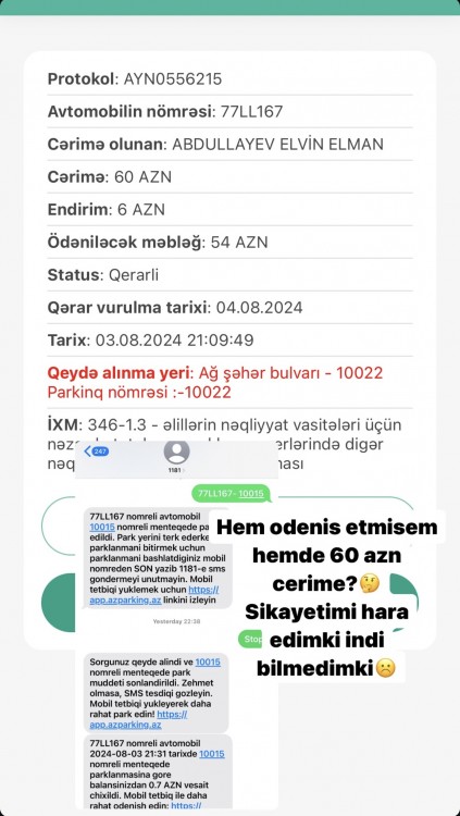 O, avtomobilini ödənişli dayanacaqda saxladığını və ödəniş etdiyi halda 60 manat cərimə yazıldığını bildirib.