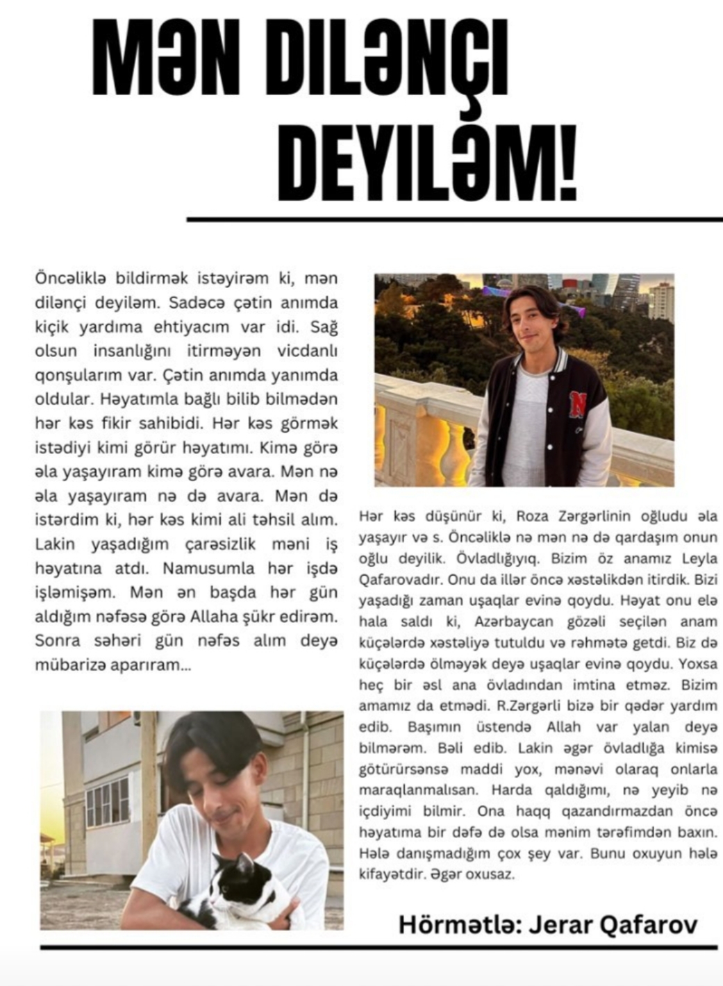"Öncə bildirmək istəyirəm ki, mən dilənçi deyiləm. Sadəcə çətin anımda kiçik yardıma ehtiyacım var idi. Sağ olsunlar, insanlığı itirməyən vicdanlı qonşularım çətin anımda yanımda oldular.