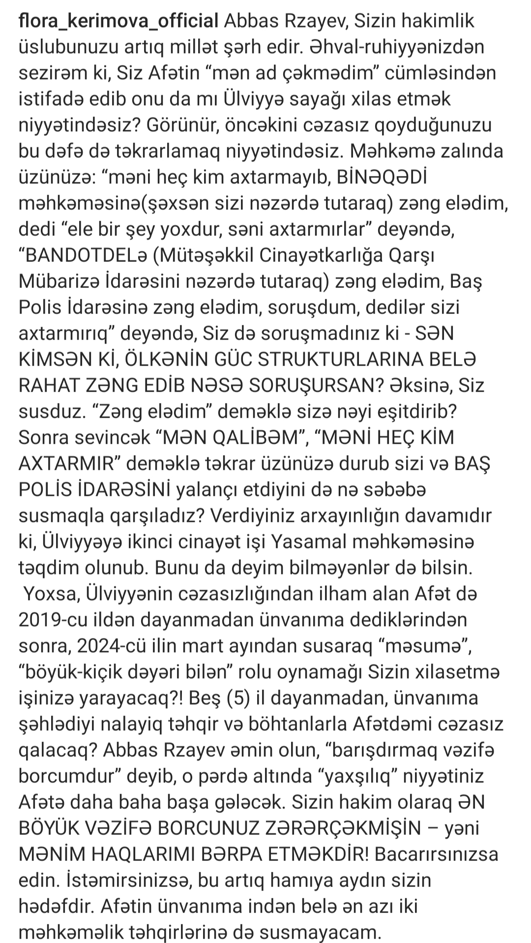 Teleqraf.com xəbər verir ki, Flora Kərimova bu haqda İnstaqram hesabında məlumat verib: "Abbas Rzayev, sizin hakimlik üslubunuzu artıq millət şərh edir. Əhval-ruhiyyənizdən sezirəm ki, Afətin “mən ad çəkmədim” cümləsindən istifadə edib onu da Ülviyyəsayağı xilas etmək niyyətindəsiz. Görünür, öncəkini cəzasız qoyduğunuzu bu dəfə də təkrarlamaq istəyirsiz. Verdiyiniz arxayınlığın davamıdır ki, Ülviyyəyə ikinci cinayət işi Yasamal məhkəməsinə təqdim olunub. Bunu deyim, bilməyənlər də bilsin.