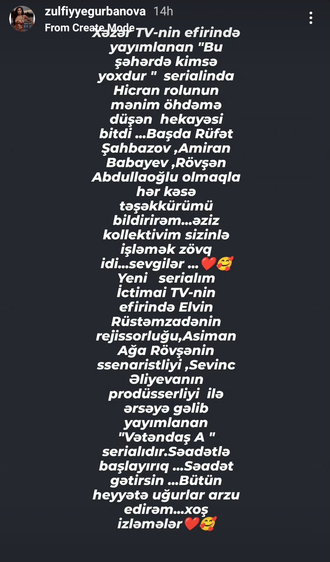 Teleqraf.com xəbər verir ki, aktrisa bu haqda İnstaqramda hekayə bölümündə məlumat verib: “Xəzər” TV-nin efirində yayımlanan “Bu şəhərdə kimsə yoxdur” serialında Hicran rolunun mənim öhdəmə düşən hekayəsi bitdi. Başda Rüfət Şahbazov, Amiran Babayev, Rövşən Abdullaoğlu olmaqla hər kəsə təşəkkürümü bildirirəm. Sizinlə işləmək zövq idi. Yeni işim “İctimai” TV-nin efirində yayımlanan “Vətəndaş A” serialıdır. Səadət rolunda başlayırıq...”
