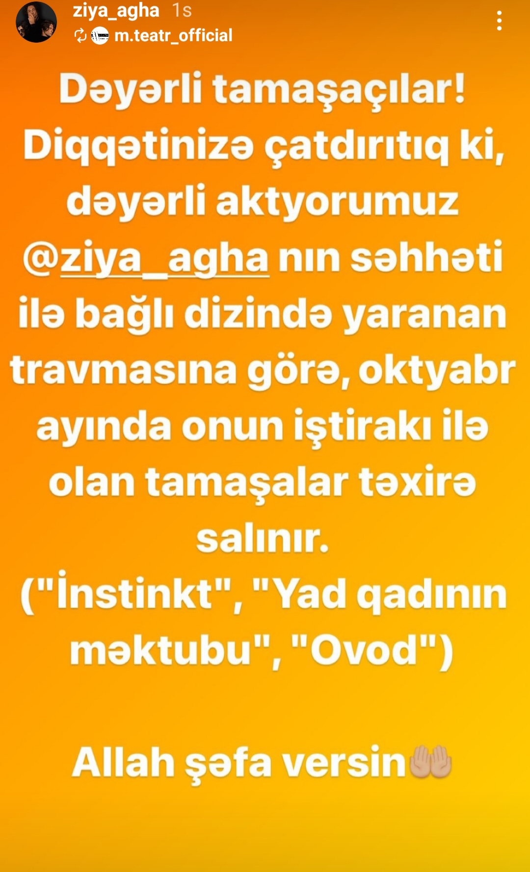 Belə ki, aktyorun dizindəki zədəsinə görə oktyabr repertuarına daxil olan "İnstinkt", "Yad Qadının məktubu", "Ovod" tamaşaları təxirə salınıb.