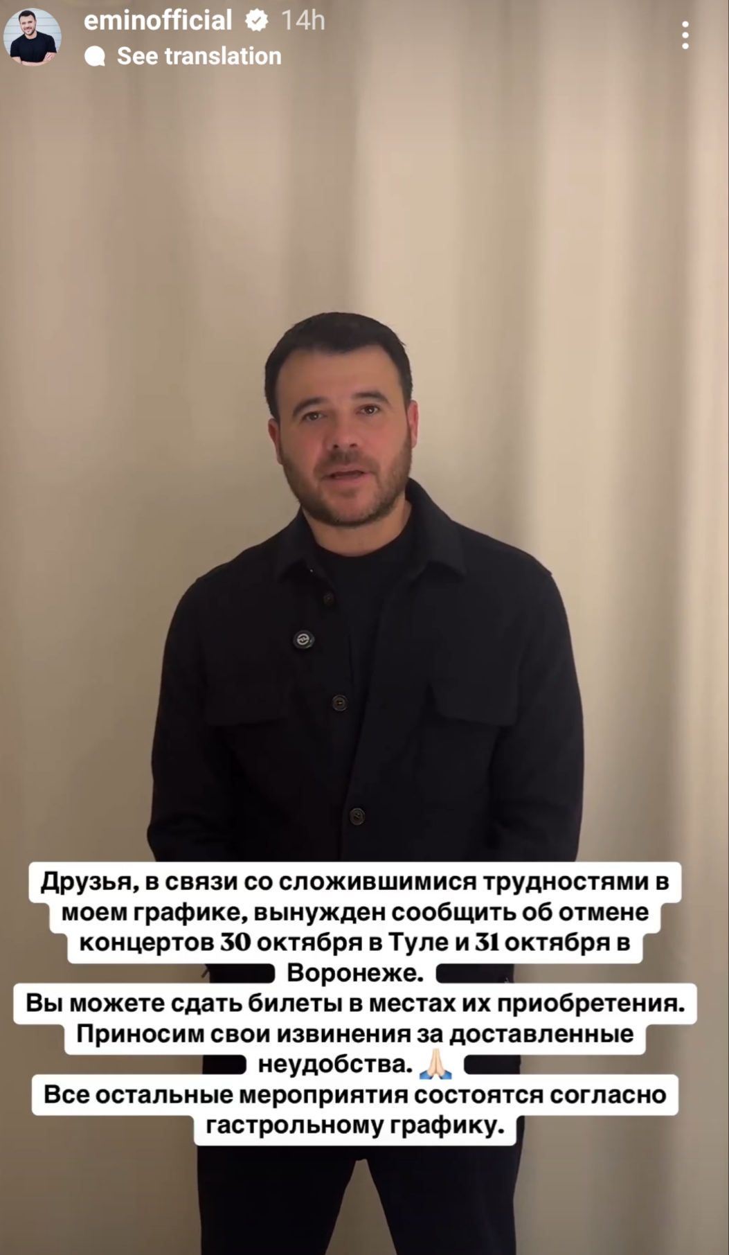 Xalq artisti oktyabrın 30-da Tulada, oktyabrın 31-də Voronejdəki konsert proqramlarının ləğv edildiyini açıqlayıb və alınan biletlərin pulunun geri qaytarılacağını bildirib.
