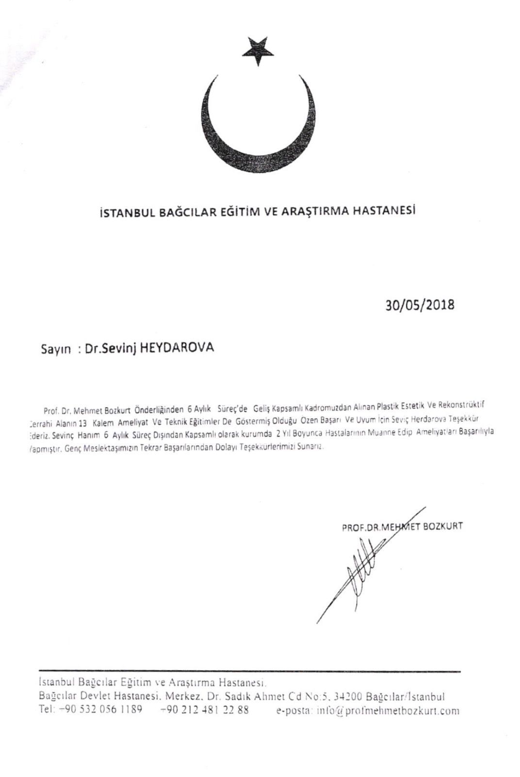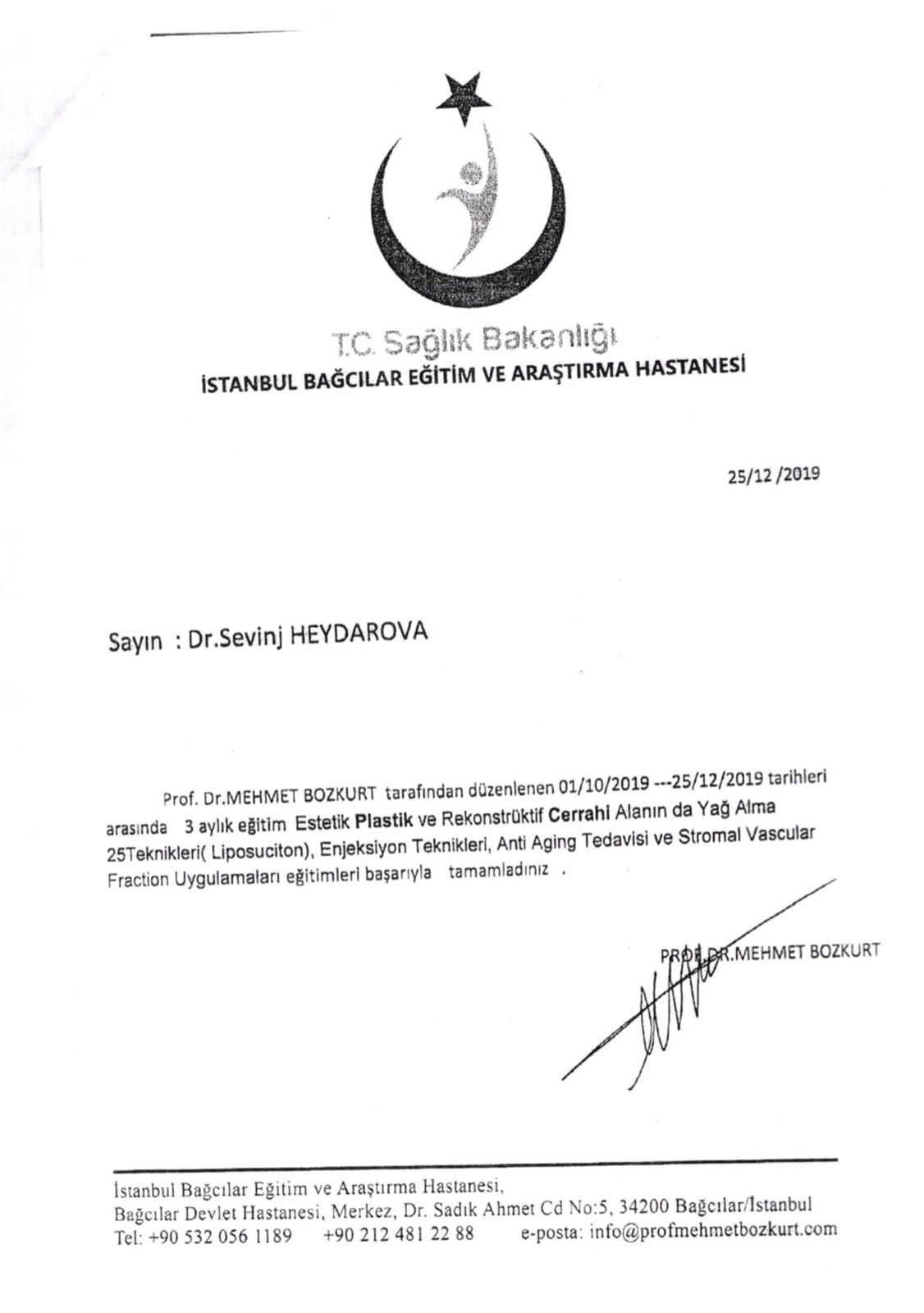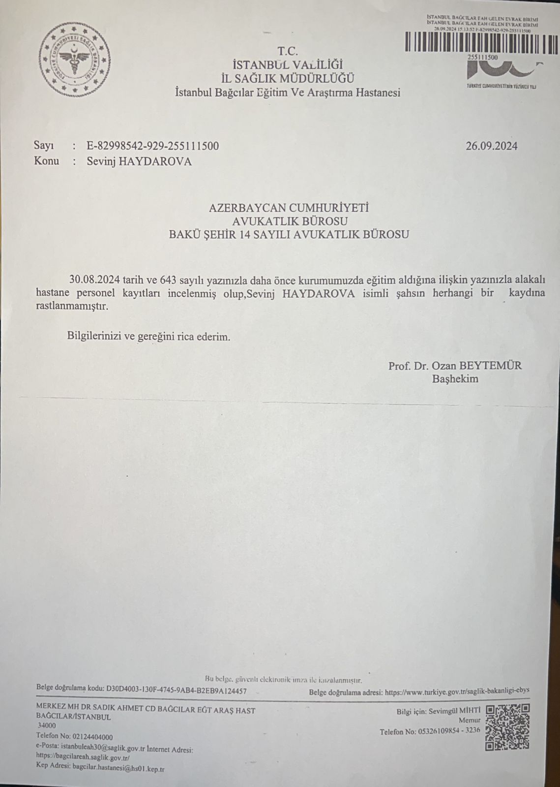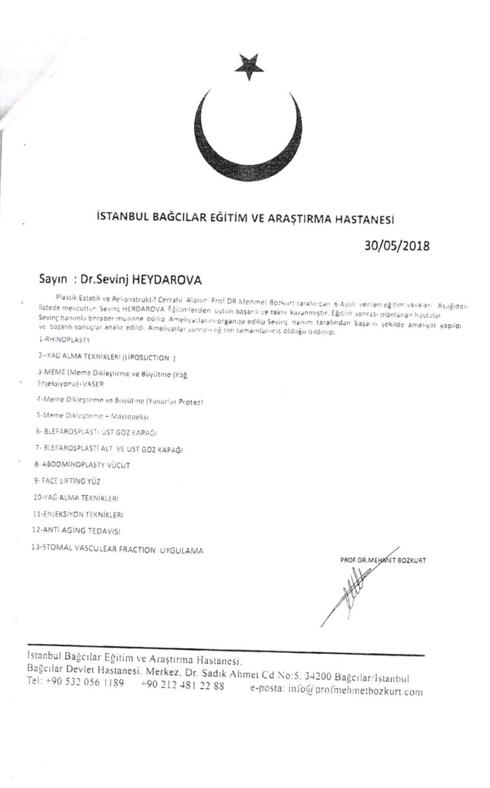Sevinc Heydərova Səhiyyə Nazirliyinə sənəd təqdim edib ki, filan tarixdə Türkiyədə cərrahi əməliyyatlar edib, rekonstruktiv cərrahi əməliyyatlar haqqında altı ay kurs keçib.