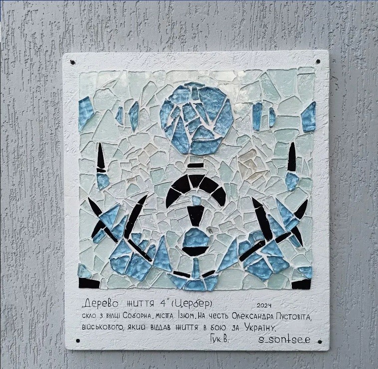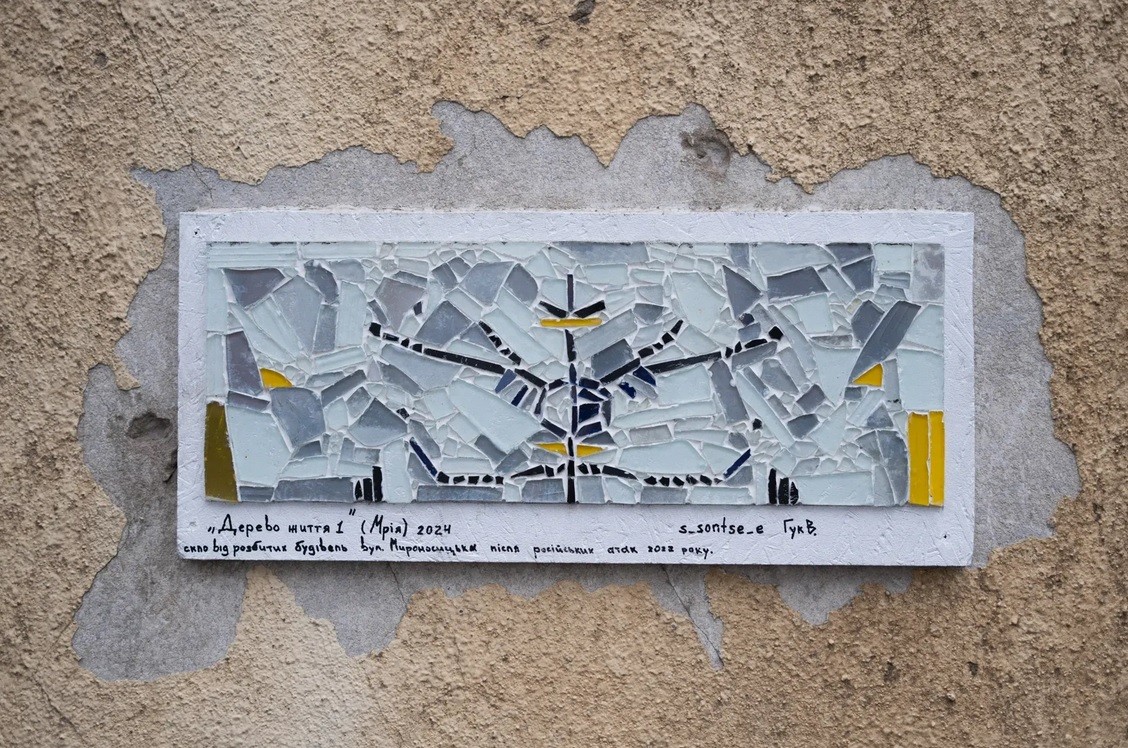 Qadın rus raketlərinin zərbələri nəticəsində qırılmış şüşələrdən mozaika nümunələri yaradır. Başqa sözlə, ölümdən həyat düzəldir.