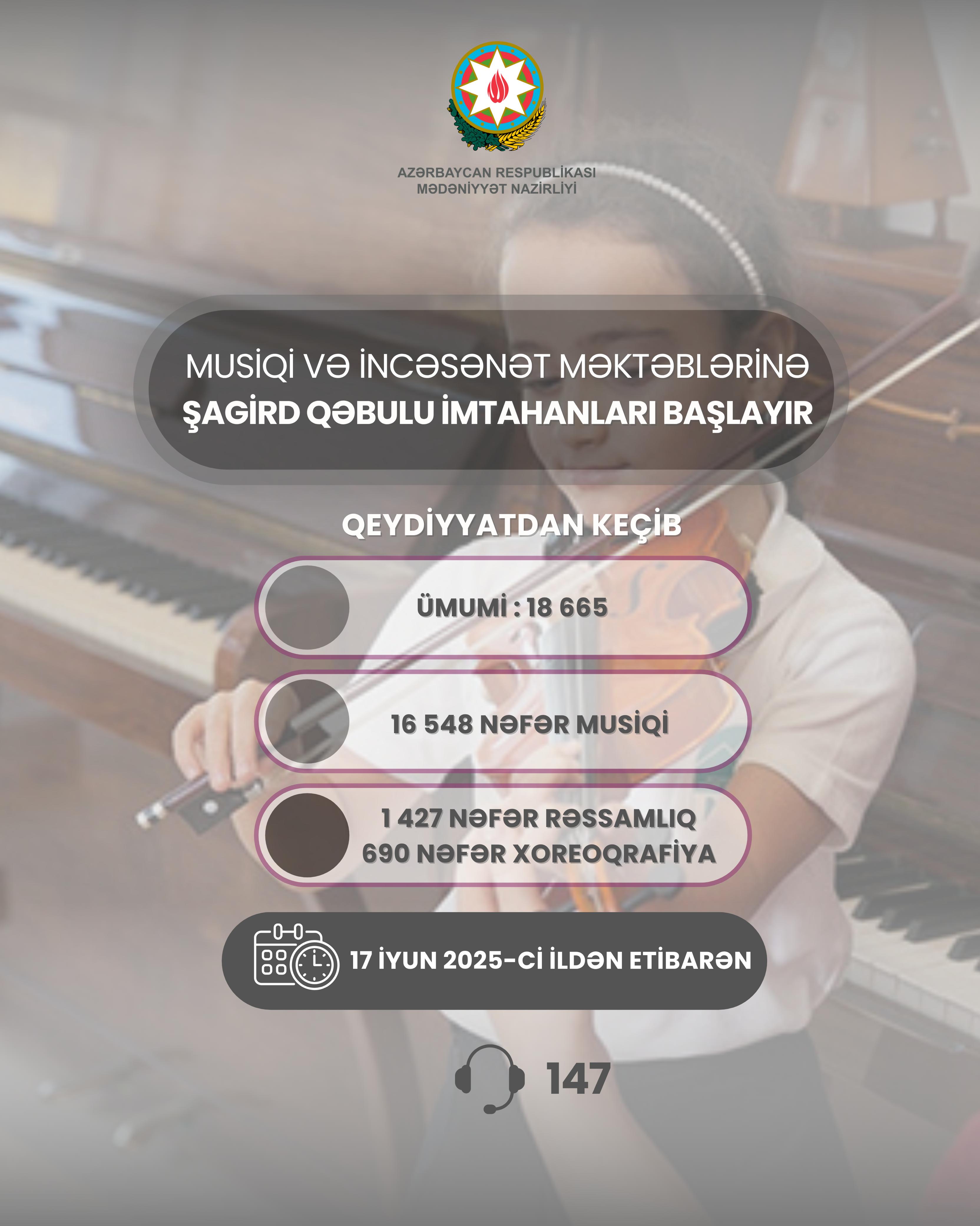 17 iyun 2025-ci il tarixindən etibarən Mədəniyyət Nazirliyinin tabeliyində fəaliyyət göstərən uşaq musiqi, incəsənət məktəb və mərkəzlərinə 2025/2026-cı tədris ili üzrə I sinfə şagird qəbulu imtahanları başlayır.