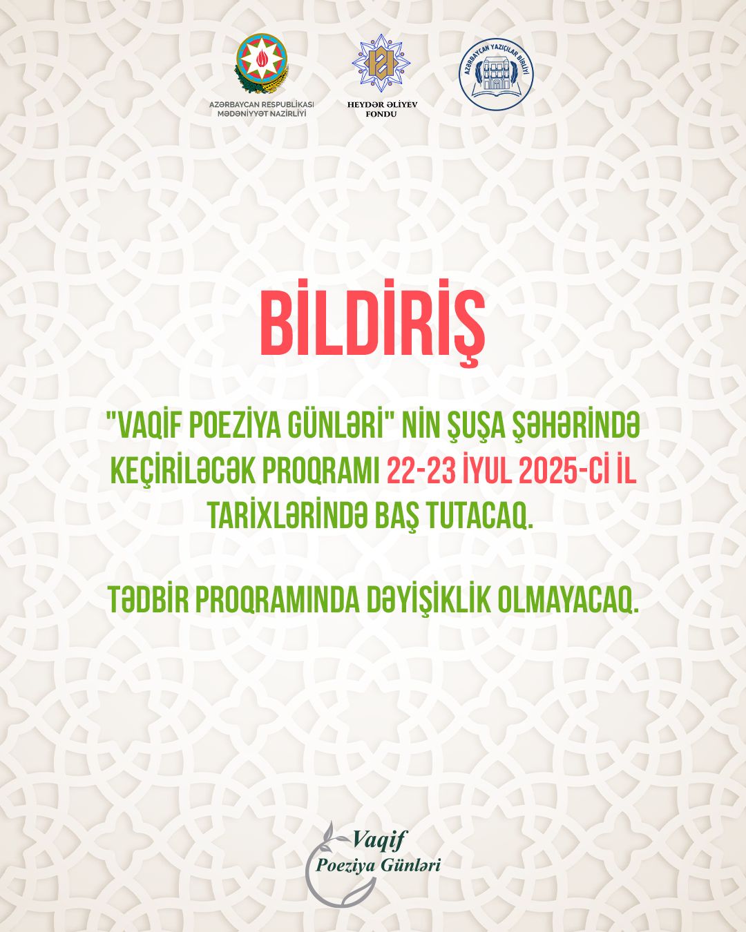 Mədəniyyət Nazirliyinin təşkilatçılığı ilə keçirilən “Vaqif Poeziya Günləri”nin Şuşa mərhələsinin keçirilmə tarixi dəyişdirilib.