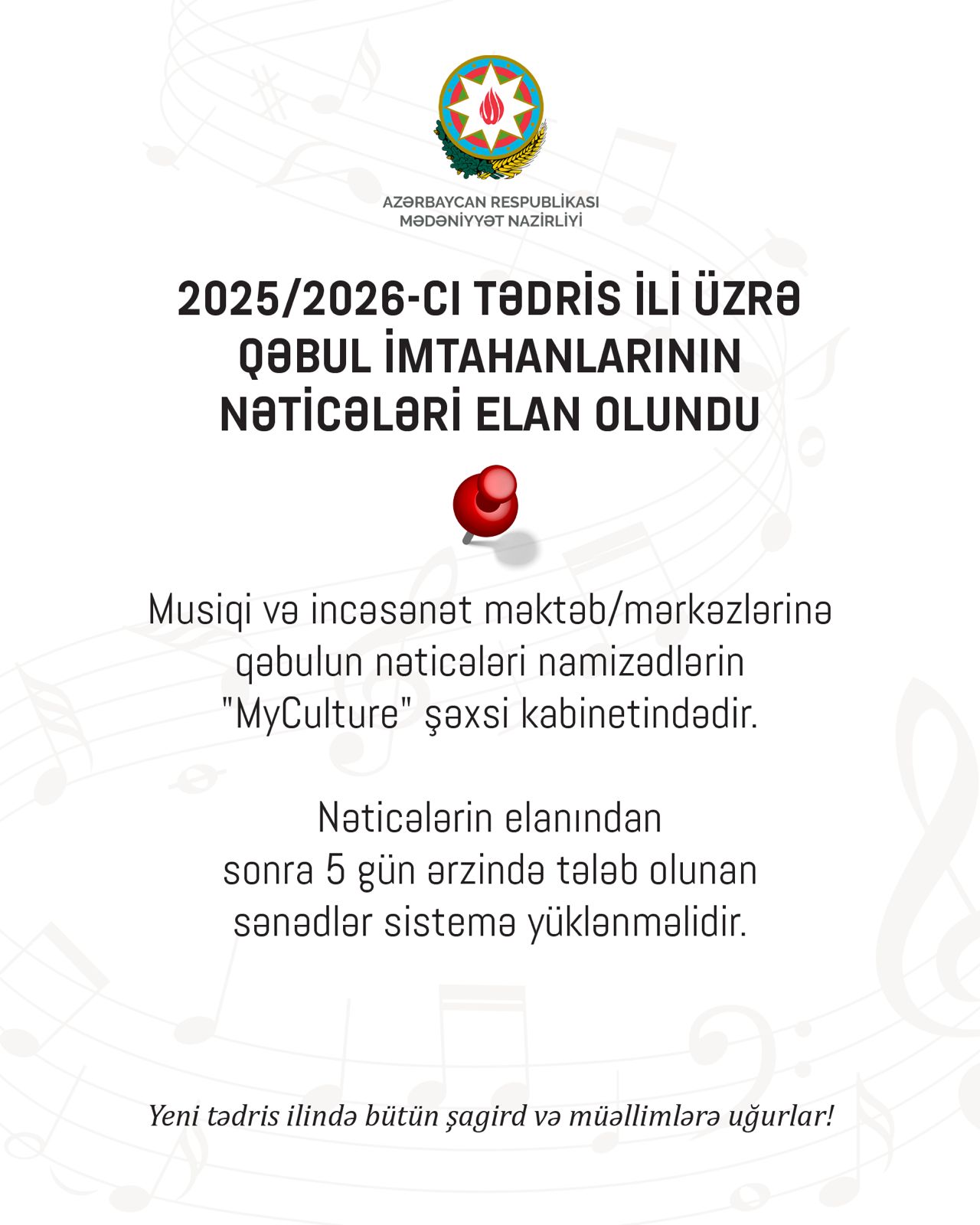 Nəticələr elan olunduğu tarixdən etibarən 5 gün ərzində namizədlər “MyCulture” şəxsi kabineti üzərindən tələb olunan sənədləri qəbulu təsdiqləmək məqsədilə sistemə yükləməlidirlər.
