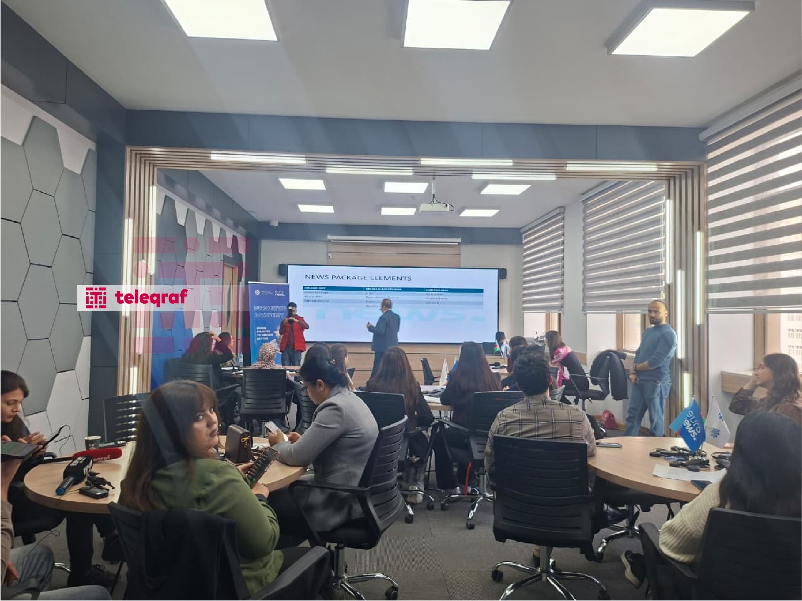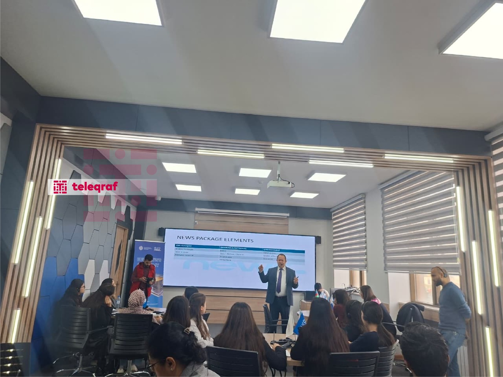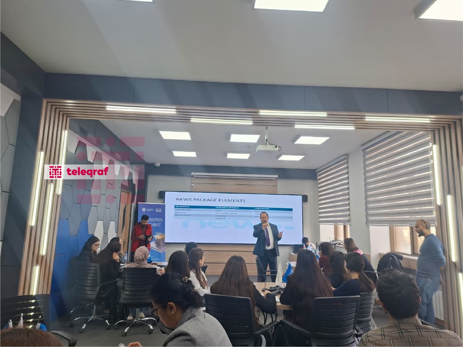 Dördgünlük təlim proqramı Medianın İnkişafı Agentliyinin Bakı Dövlət Universitetindəki xüsusi auditoriyasında “Televiziya xəbərlərinin hazırlanması, televiziya reportajları və canlı yayım” mövzusu ilə başlayıb. İştirakçılar “Euronews” telekanalının Astana bürosunun rəhbəri, televiziya yayımı sahəsində geniş təcrübəyə malik peşəkar jurnalist və media rəhbəri Bojan Brkiçin təqdimatında xəbər süjetlərinin hazırlanması, efir üçün materialların strukturlaşdırılması və canlı bağlantıların idarə olunması kimi praktiki bacarıqlarla tanış olublar.