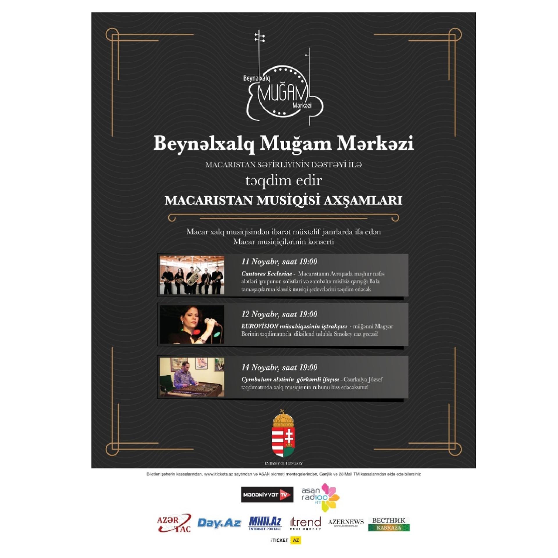 Beynəlxalq Muğam Mərkəzindən Teleqraf.com-a verilən məlumata görə, paytaxt sakinləri və şəhərimizin qonaqları noyabrın 11-12 və 14-də macar xalq musiqisindən ibarət müxtəlif janrlarda ifa edən macar musiqiçilərinin ifalarını dinləmək imkanı qazanacaqlar.
