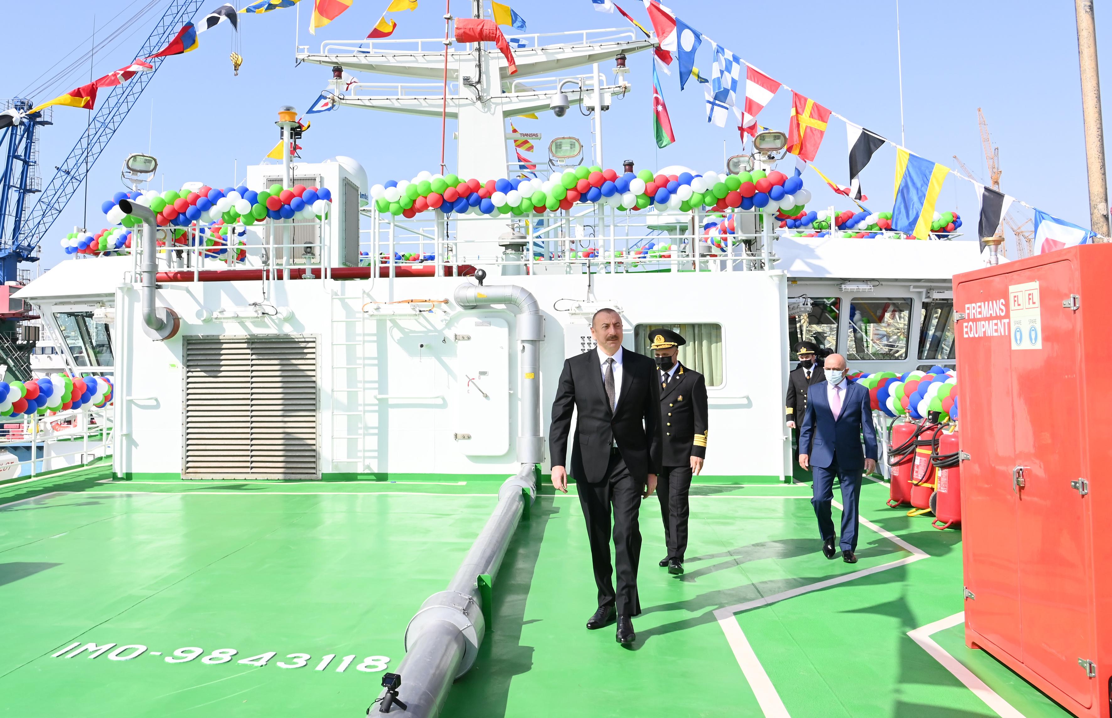 Prezident İlham Əliyev gəmi-bərənin istismara verilməsini bildirən rəmzi lenti kəsib.