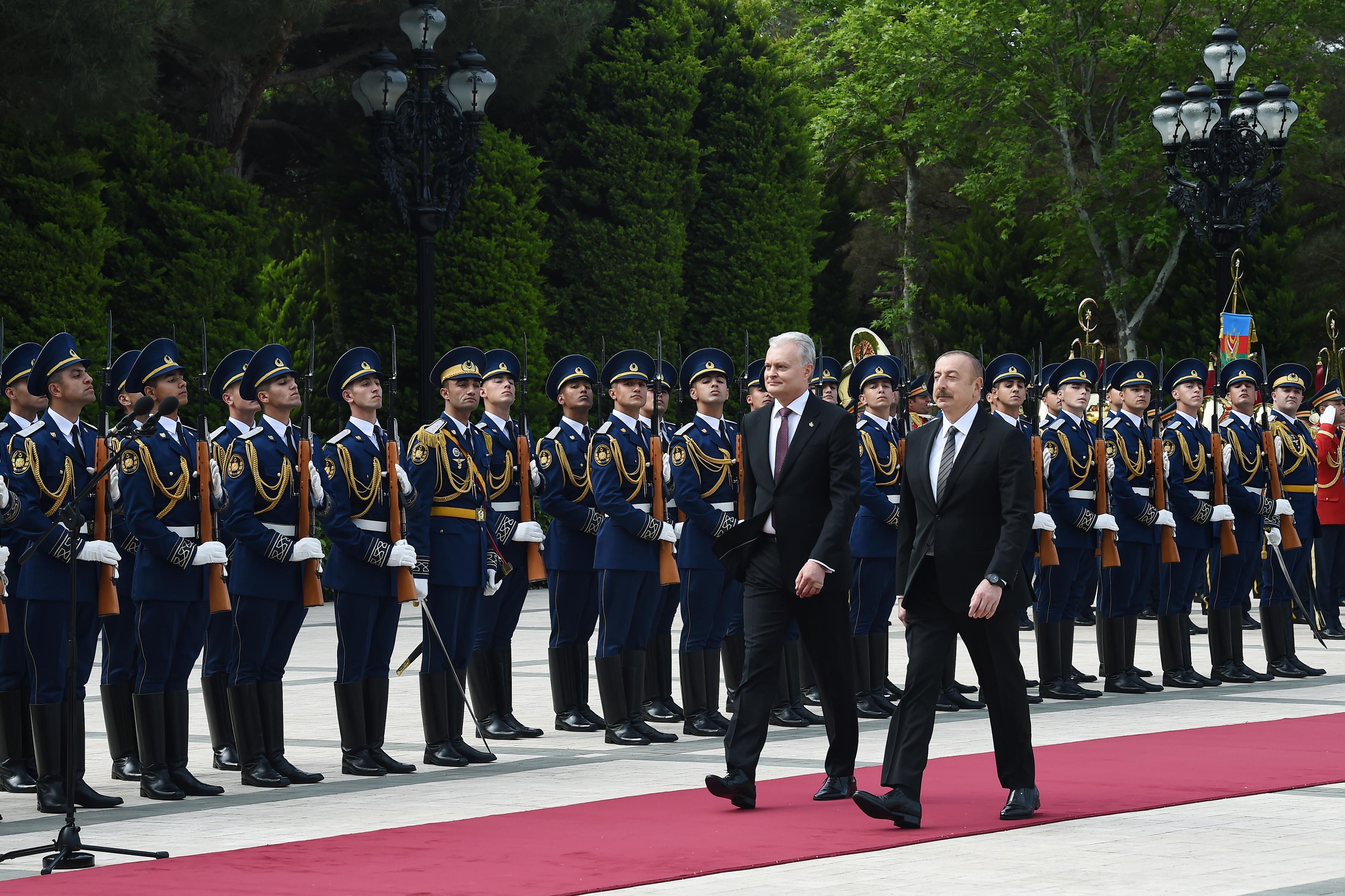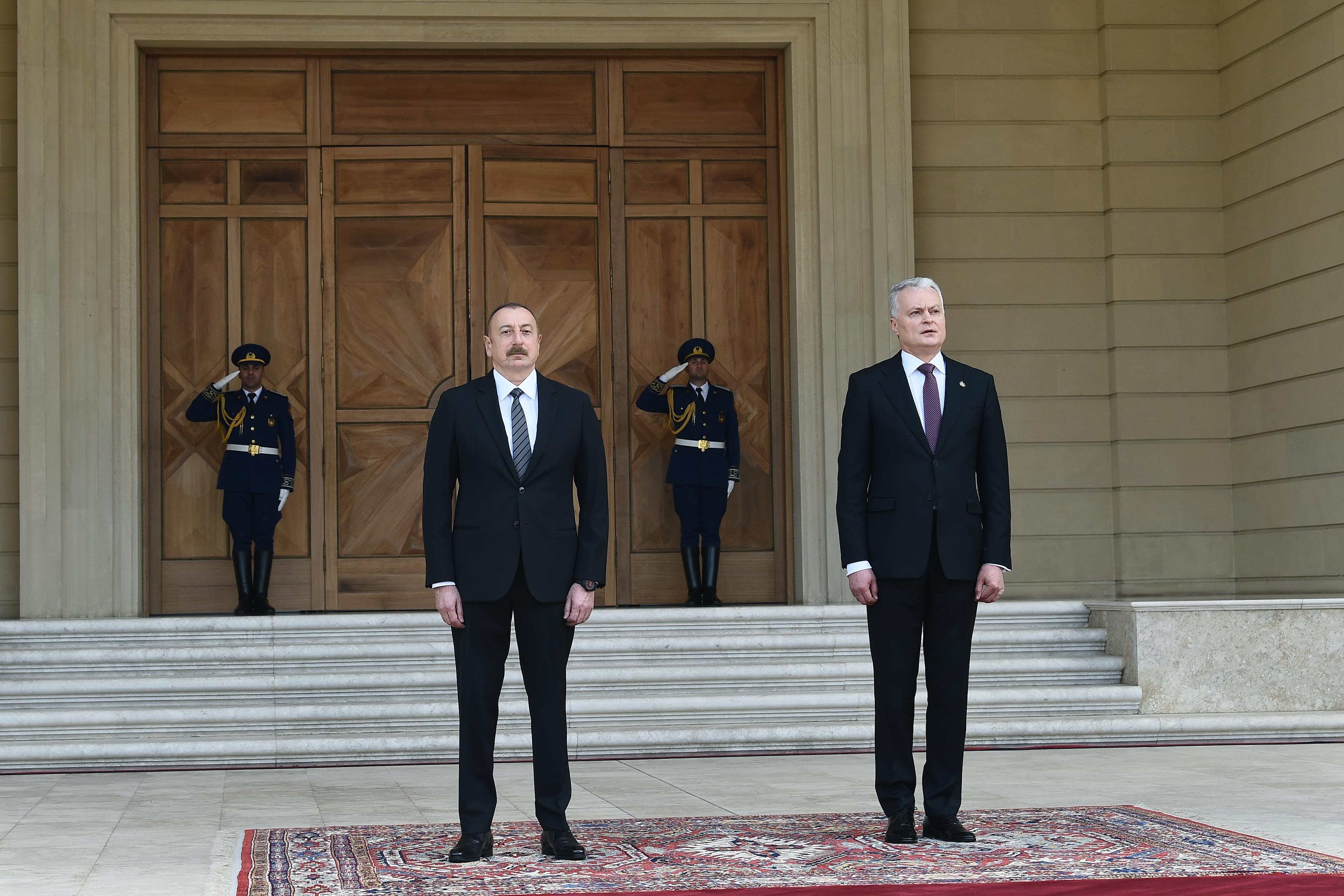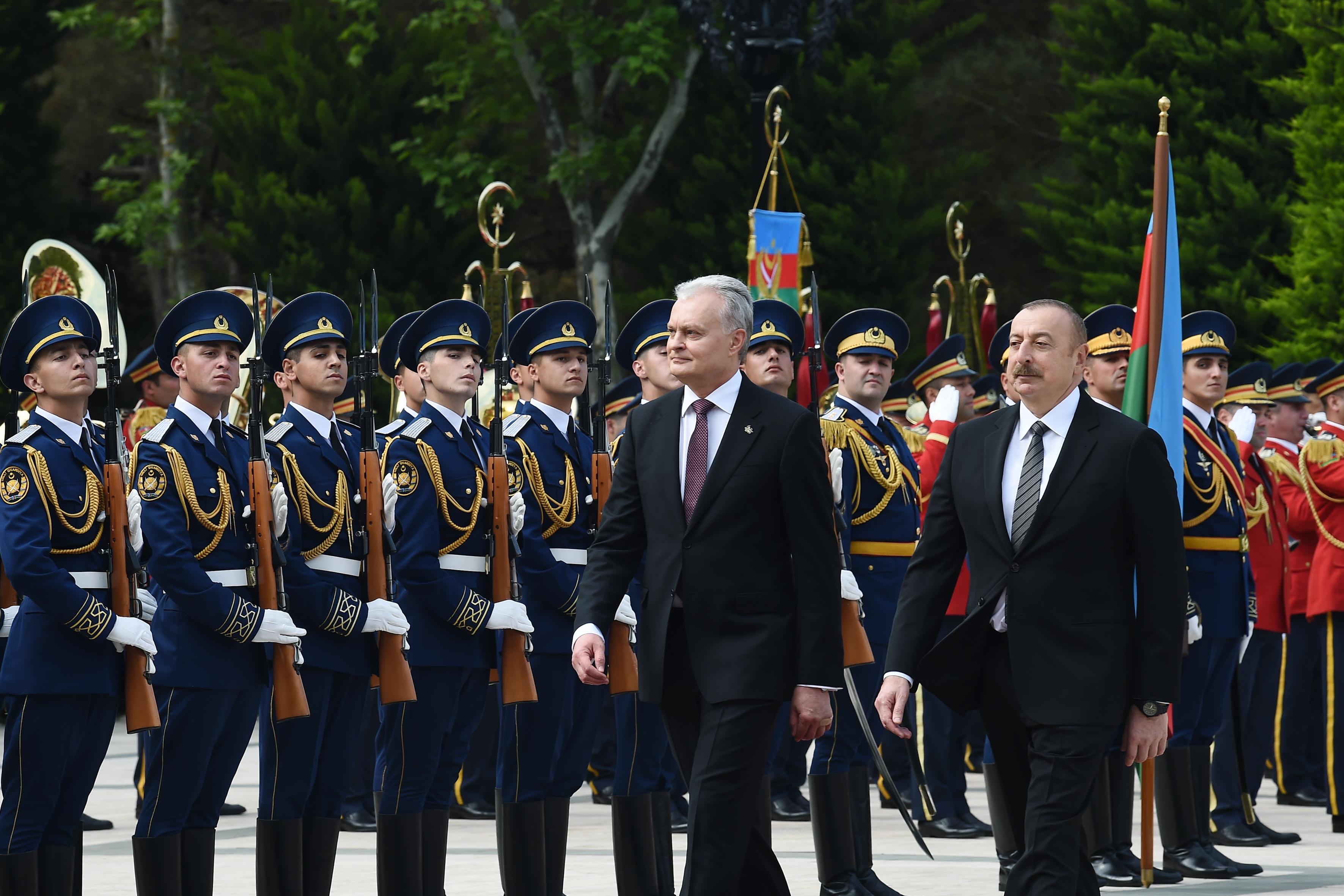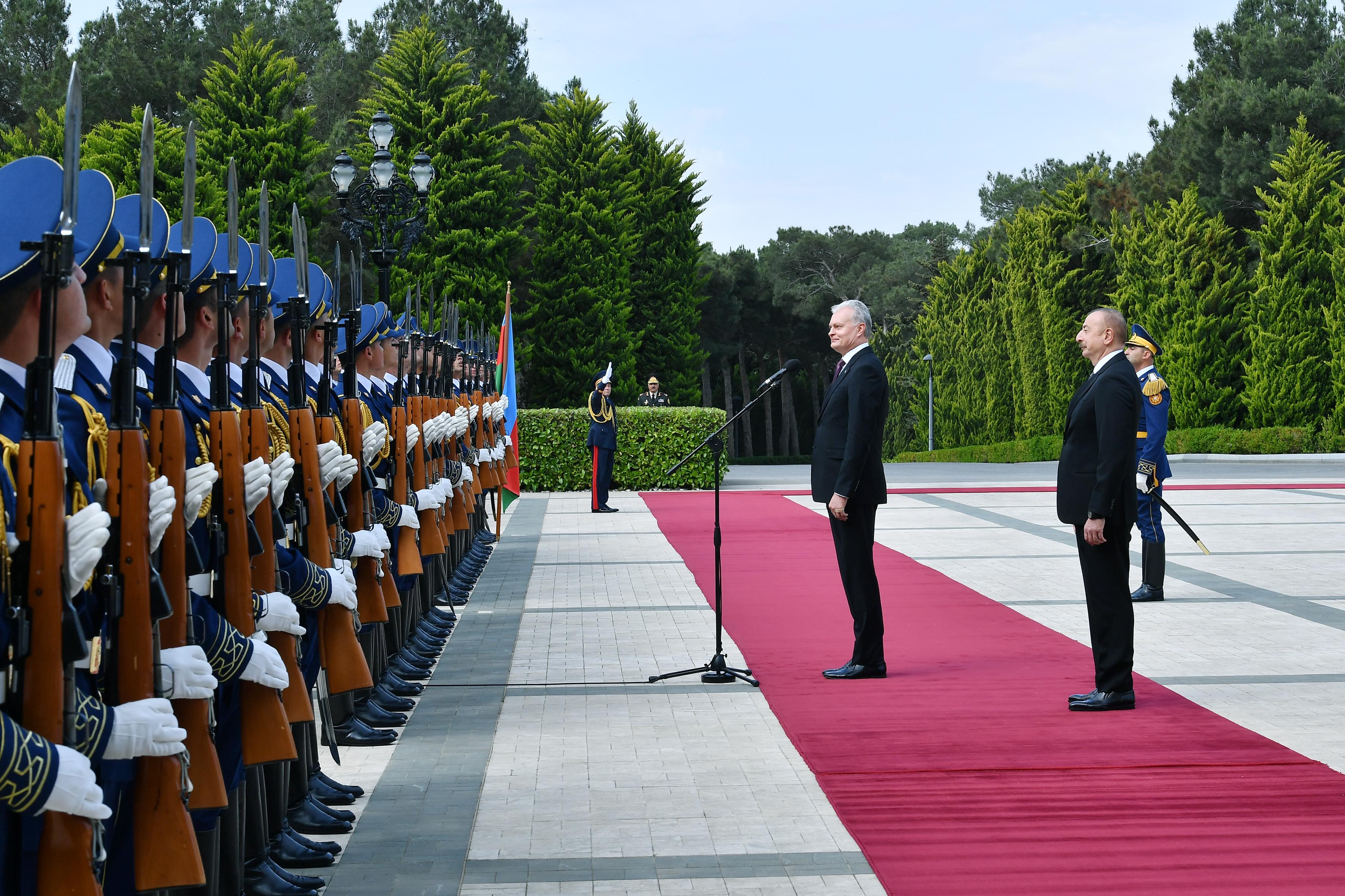 Teleqraf.com xəbər verir ki, hər iki ölkənin dövlət bayraqlarının dalğalandığı meydanda Litva Respublikasının Prezidentinin şərəfinə fəxri qarovul dəstəsi düzülüb.