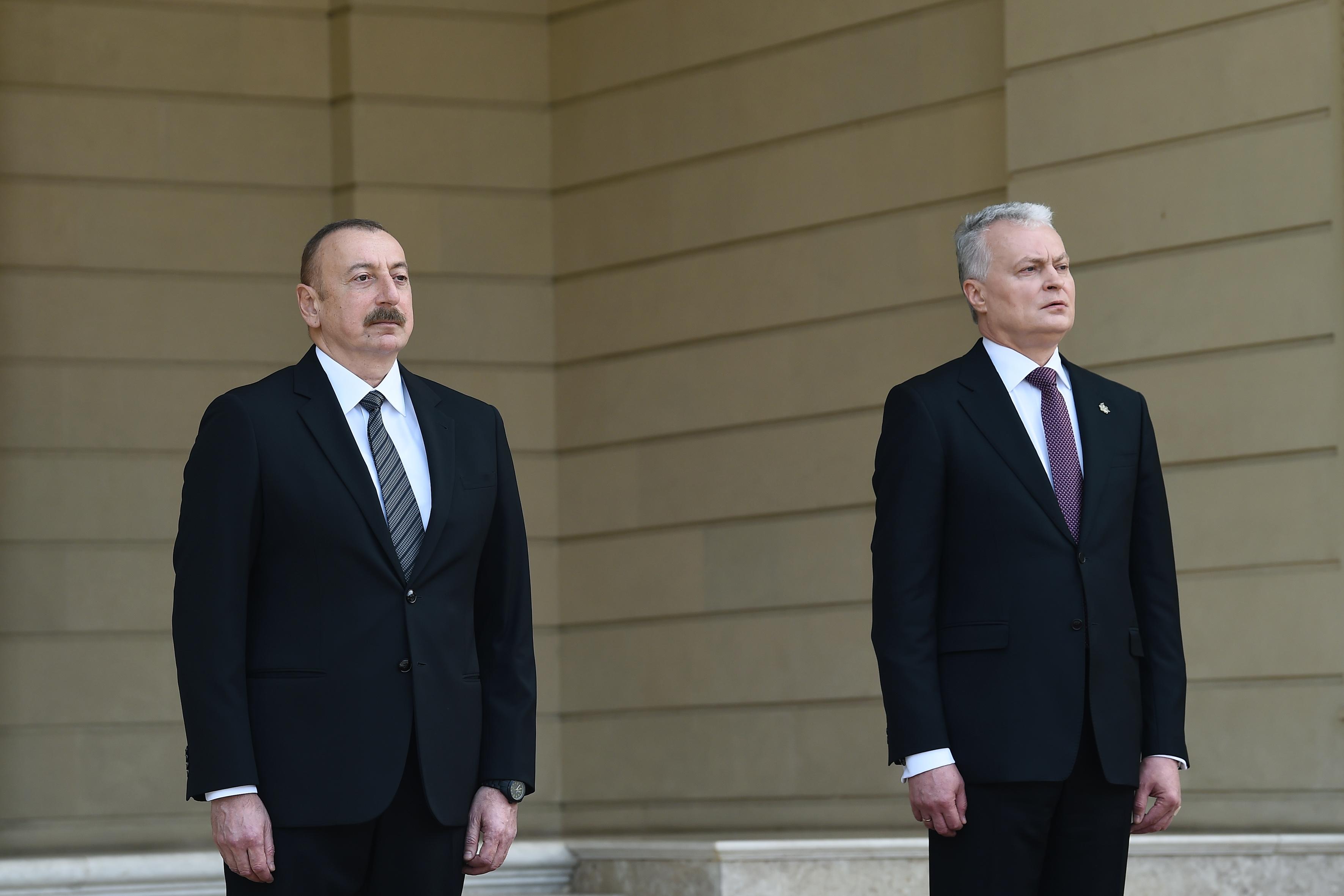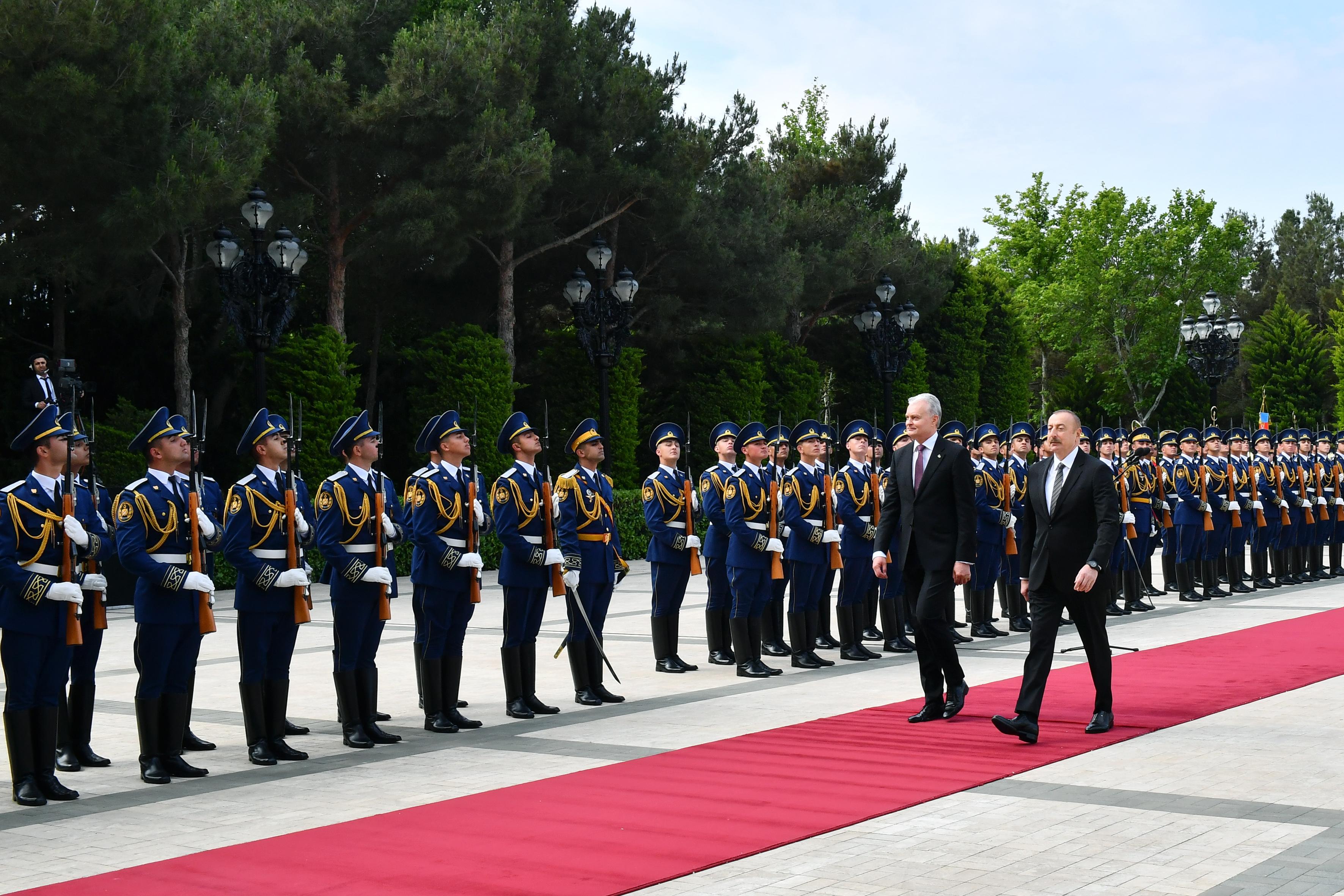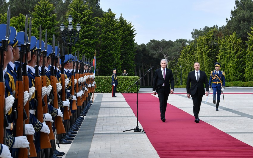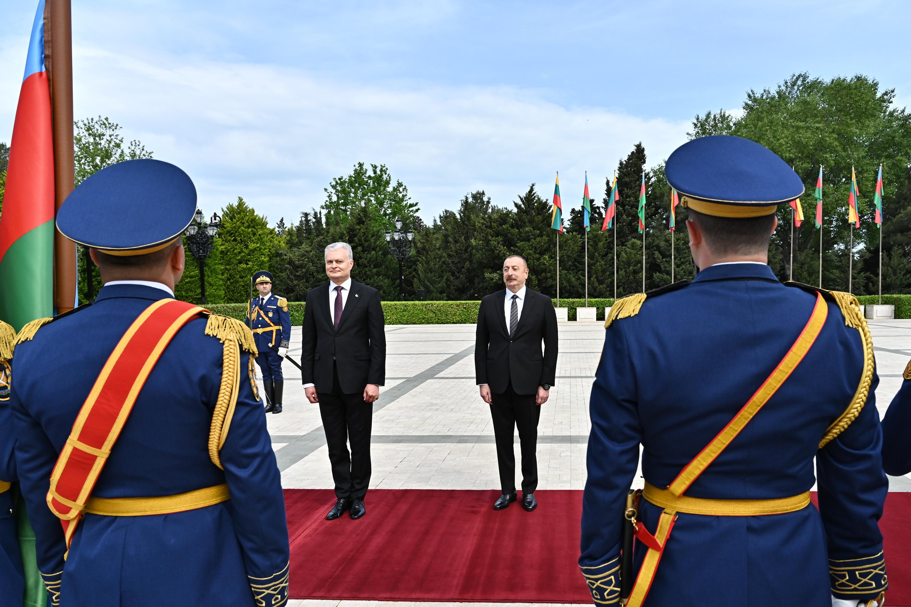 Teleqraf.com xəbər verir ki, hər iki ölkənin dövlət bayraqlarının dalğalandığı meydanda Litva Respublikasının Prezidentinin şərəfinə fəxri qarovul dəstəsi düzülüb.