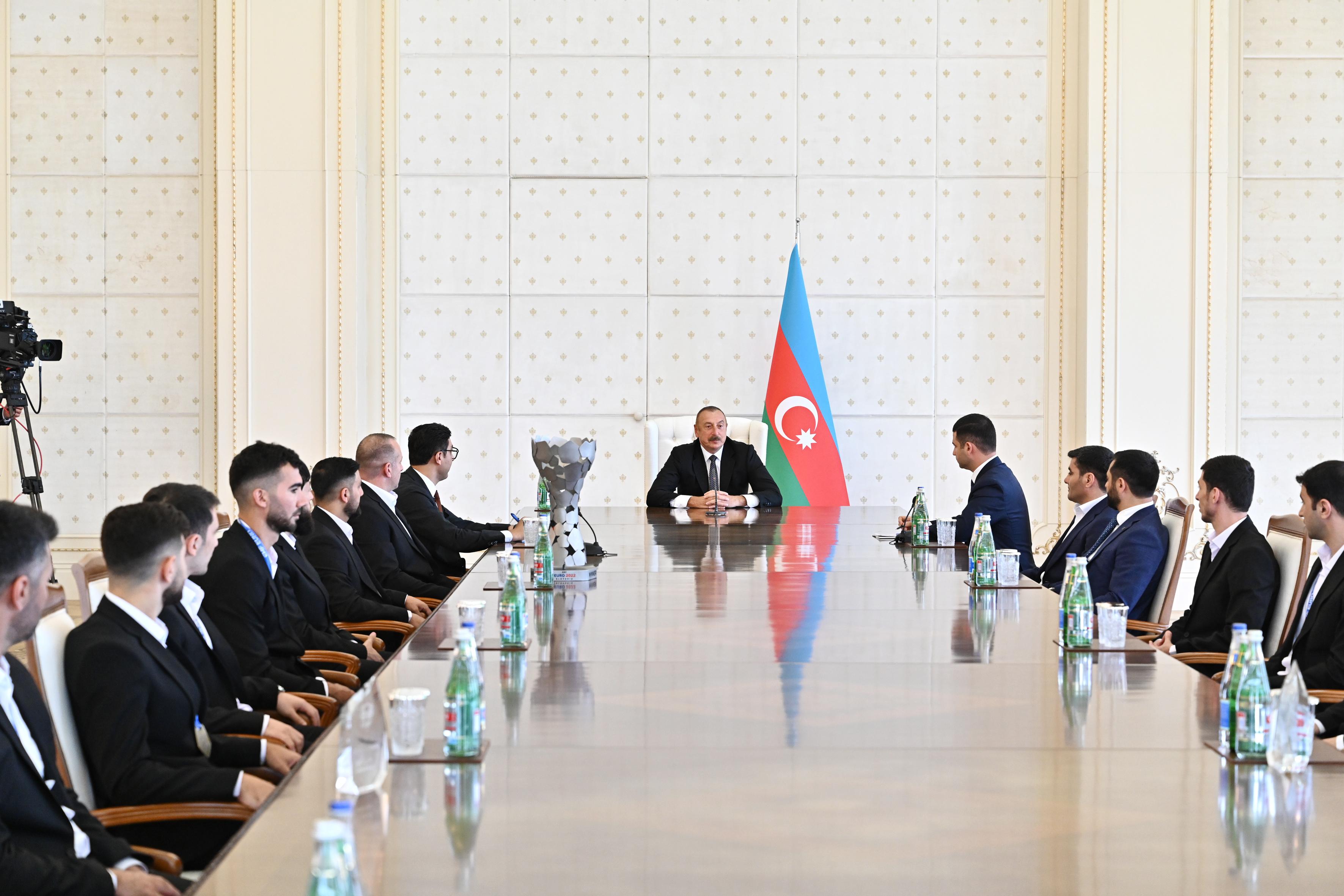 Şadam ki, komandamızın tərkibi yerli idmançılardan ibarətdir - həm oyunçular, həm məşqçilər, mütəxəssislər. Bu, məni xüsusilə sevindirir. Onu da bilirəm ki, minifutbol üzrə bizim komandamız cəmi ikinci dəfə Avropa çempionatında iştirak edir və artıq çempion tituluna layiq görülüb. Mübarizə gərgin olub, istənilən idman növündə Avropa çempionatları çox gərgin keçir. Əlbəttə ki, Avropanın ən güclü komandaları orada təmsil olunur. Çempionat boyunca göstərdiyiniz həm peşəkarlıq, deyə bilərəm ki, həm də böyük fədakarlıq bu qələbəni mümkün edib. Siz xalqımızı sevindirmisiniz və təsadüfi deyil ki, Azərbaycan vətəndaşları sizi hava limanında böyük məhəbbətlə qarşılayıblar. Mən sizi ürəkdən təbrik edirəm. Bu, doğrudan da çox böyük qələbədir, tarixi qələbədir.