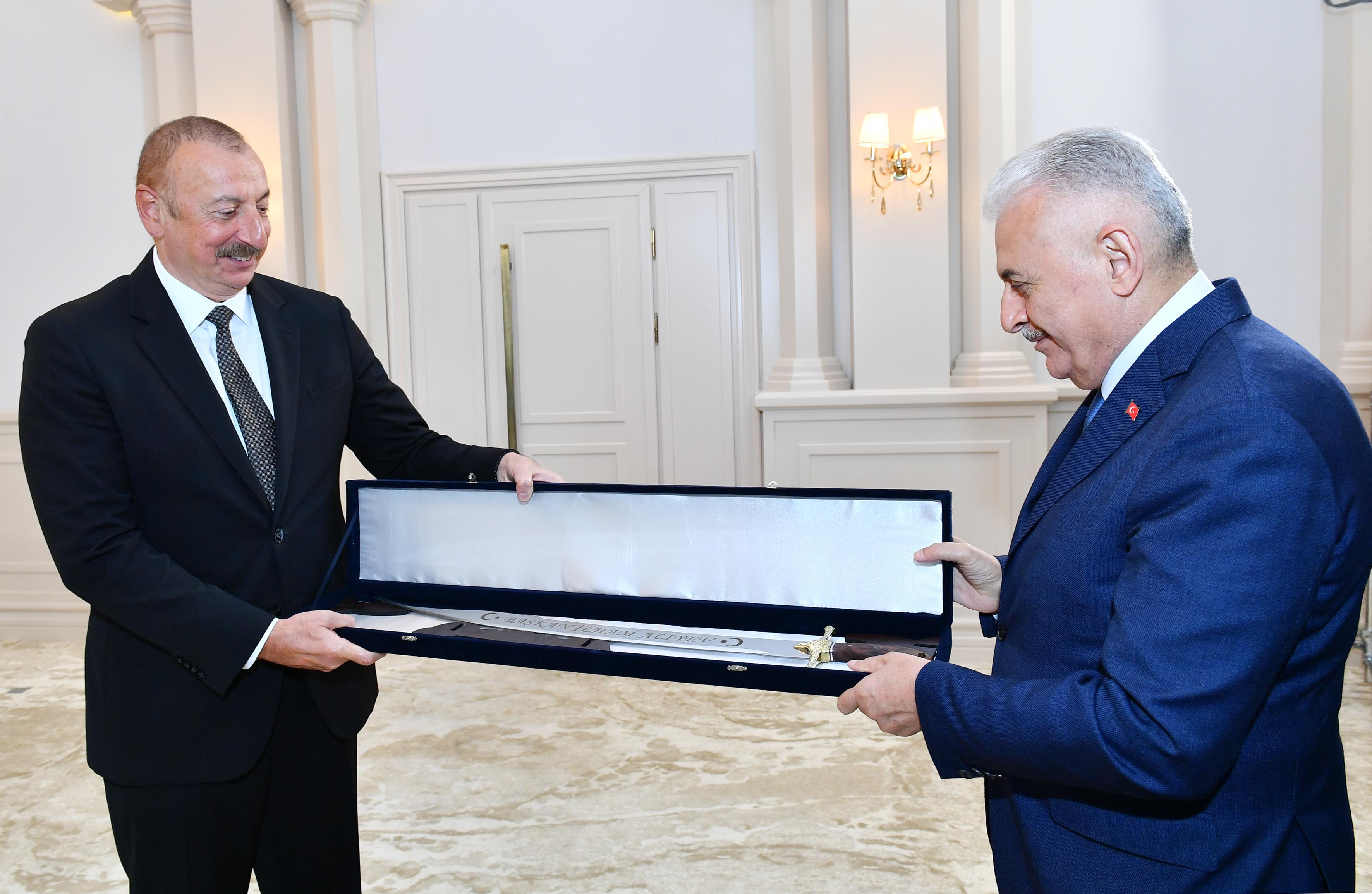 Binəli Yıldırım dövlət başçısına xatirə hədiyyəsini təqdim edərək bildirib ki, bu, İstanbulu fəth edən Fateh Sultan Mehmedin qılıncının eynisidir və Qarabağın fatehi Prezident İlham Əliyevə hədiyyə olunub.