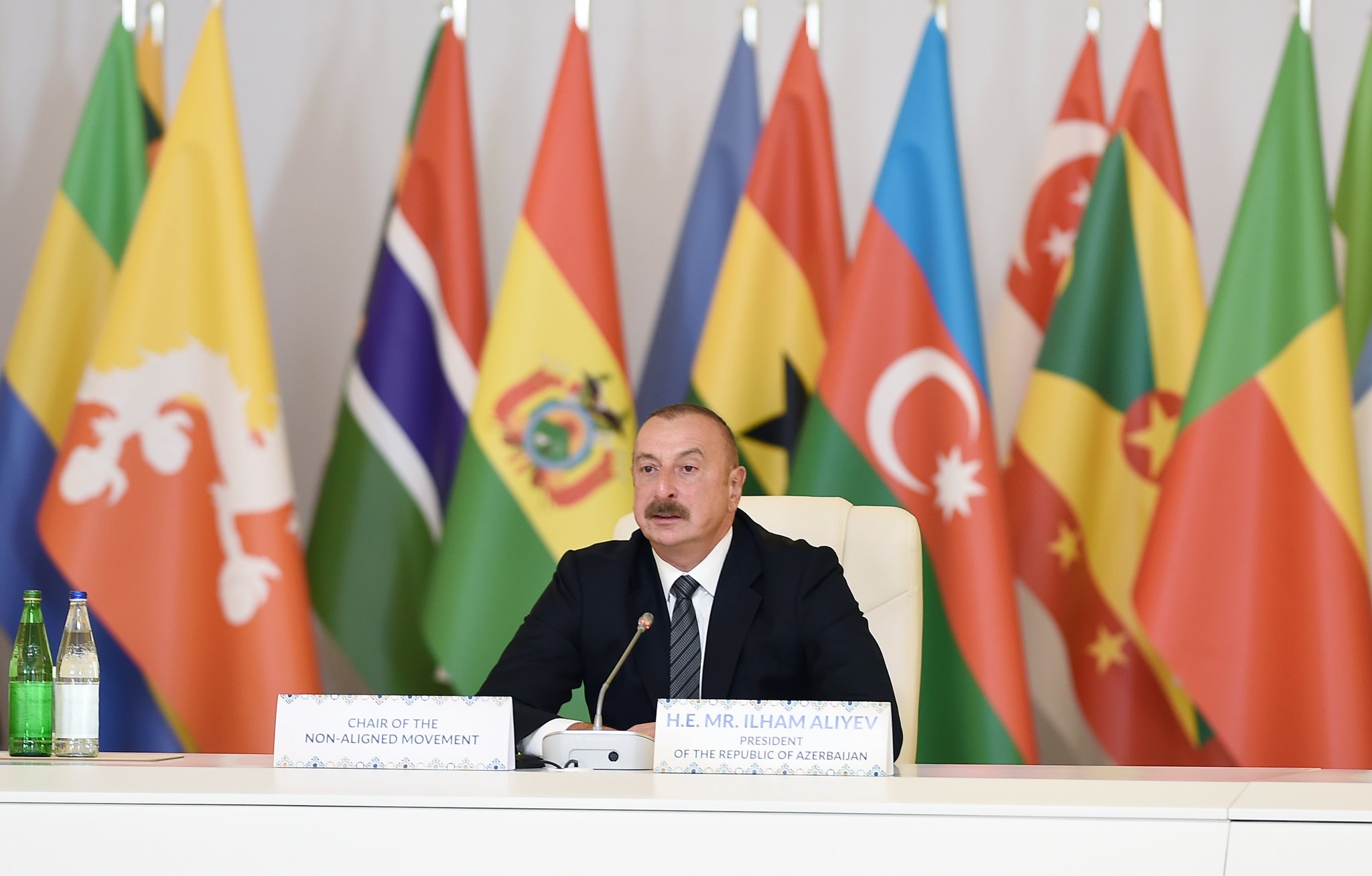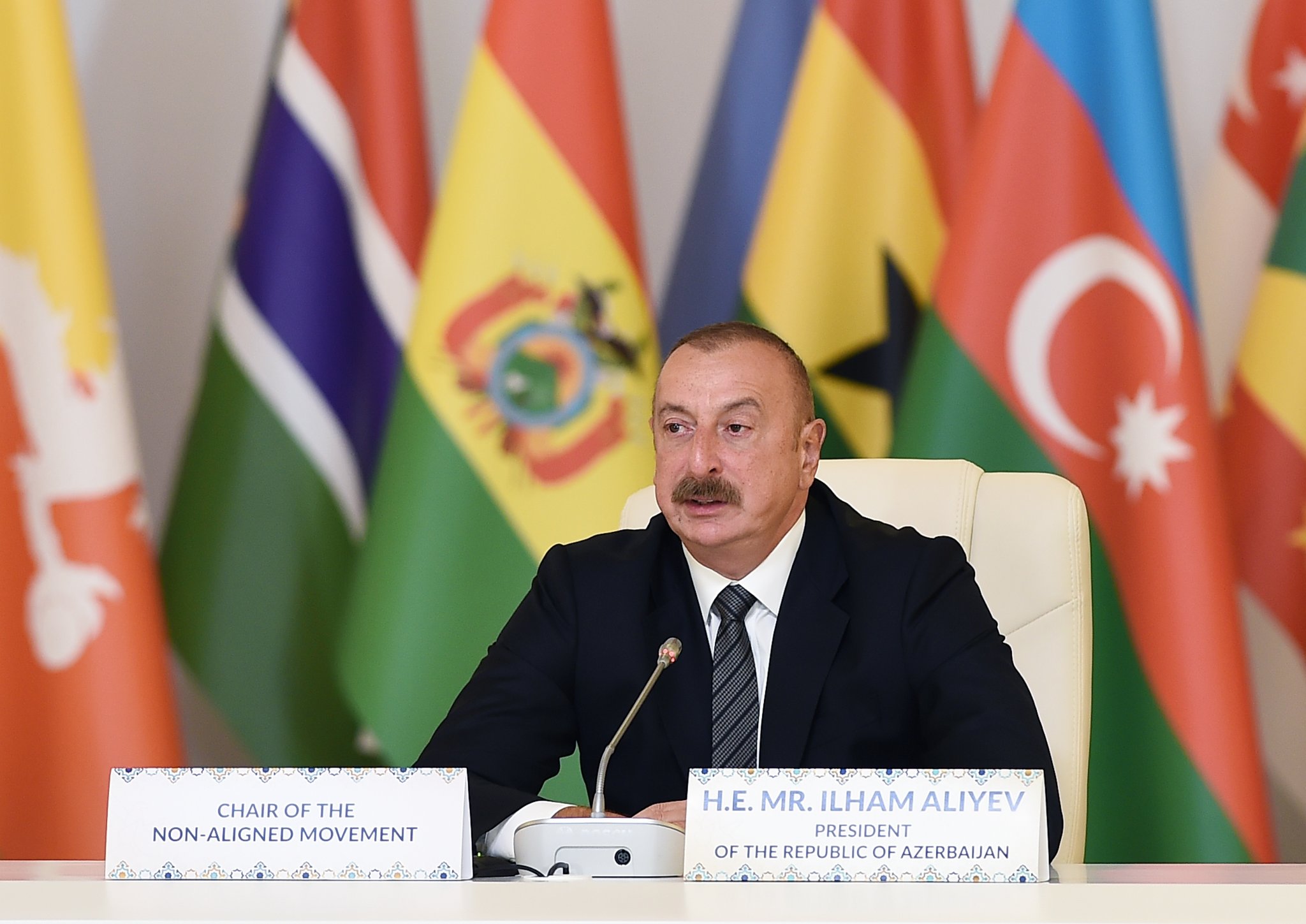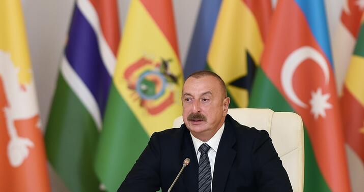 Başqa sözlə, Azərbaycan həmişə regional mövzular və qlobal məsələlərlə bağlı öz mövqeyini nümayiş etdirirdi və əlbəttə ki, Qoşulmama Hərəkatının sədri olaraq biz ədalətsizliyə, beynəlxalq hüququnun pozulmasına, müxtəlif münaqişələrə qarşı sərgilənən selektiv yanaşmaya və ayrıseçkiliyə qarşı mübarizə aparmağa davam edəcəyik. Biz, həmçinin Qoşulmama Hərəkatının üzv dövlətlərinin böyük dəstəyinin də şahidi olduq. Qeyd etdiyim kimi, Qoşulmama Hərəkatına sədrliyin verilməsi və sonra da onun uzadılması ilə bağlı yekdil qərar ölkələrin Azərbaycana olan münasibətini aydın nümayiş etdirirdi. Şahidi olduğumuz digər vacib bir həmrəylik əlaməti Ermənistan tərəfindən təqribən 30 illik işğaldan sonra torpaqlarımızın azad edilməsi zamanı ölkəmizin yaşadığı ən çətin dövrə təsadüf etdi. Biz öz torpağımızda savaşırdıq, biz ədaləti bərpa edirdik, beynəlxalq hüququ bərpa edirdik. Lakin əfsuslar olsun ki, bəzi ölkələlər bizə qarşı kampaniyaya - qarayaxma, böhtan və şantaj kampaniyasına başladılar.