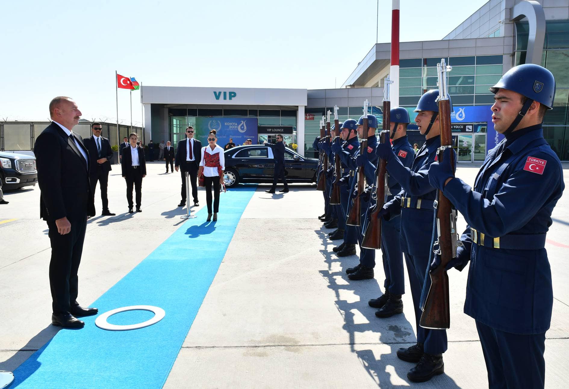 Teleqraf.com xəbər verir ki, hər iki ölkənin dövlət bayraqlarının dalğalandığı Konya şəhərinin Hava Limanında dövlətimizin başçısının şərəfinə fəxri qarovul dəstəsi düzülüb.