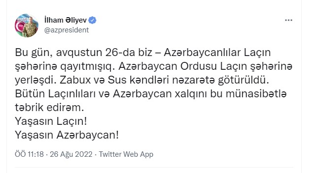 “Bu gün, avqustun 26-da biz – Azərbaycanlılar Laçın şəhərinə qayıtmışıq. Azərbaycan Ordusu Laçın şəhərinə yerləşdi. Zabux və Sus kəndləri nəzarətə götürüldü. Bütün Laçınlıları və Azərbaycan xalqını bu münasibətlə təbrik edirəm. Yaşasın Laçın! Yaşasın Azərbaycan!”