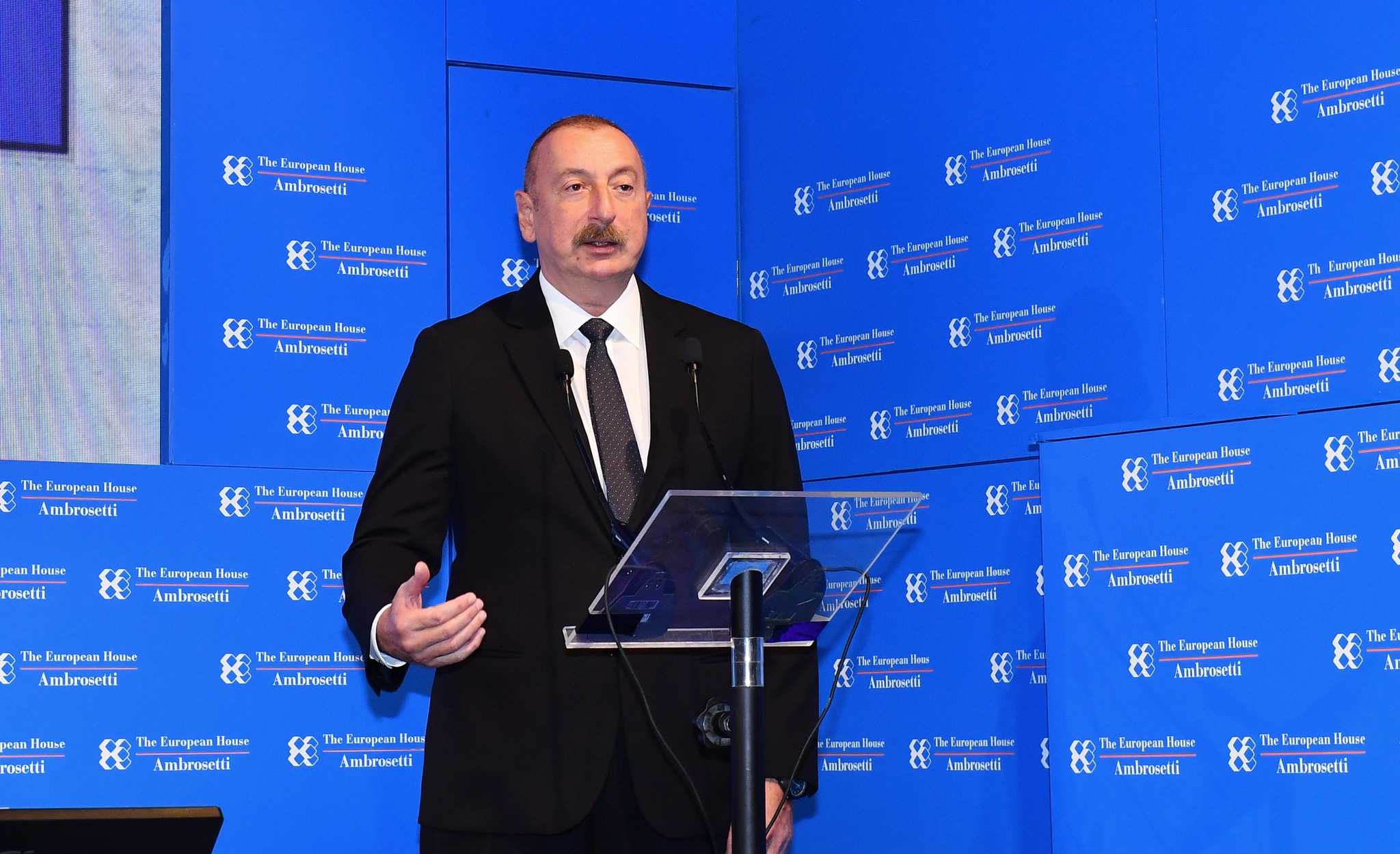 “Hazırda Prezident İlham Əliyev Ambrozetti Avropa Evinin “Dünya, Avropa və İtaliya haqqında” mövzulu forumunda çıxış edir”.