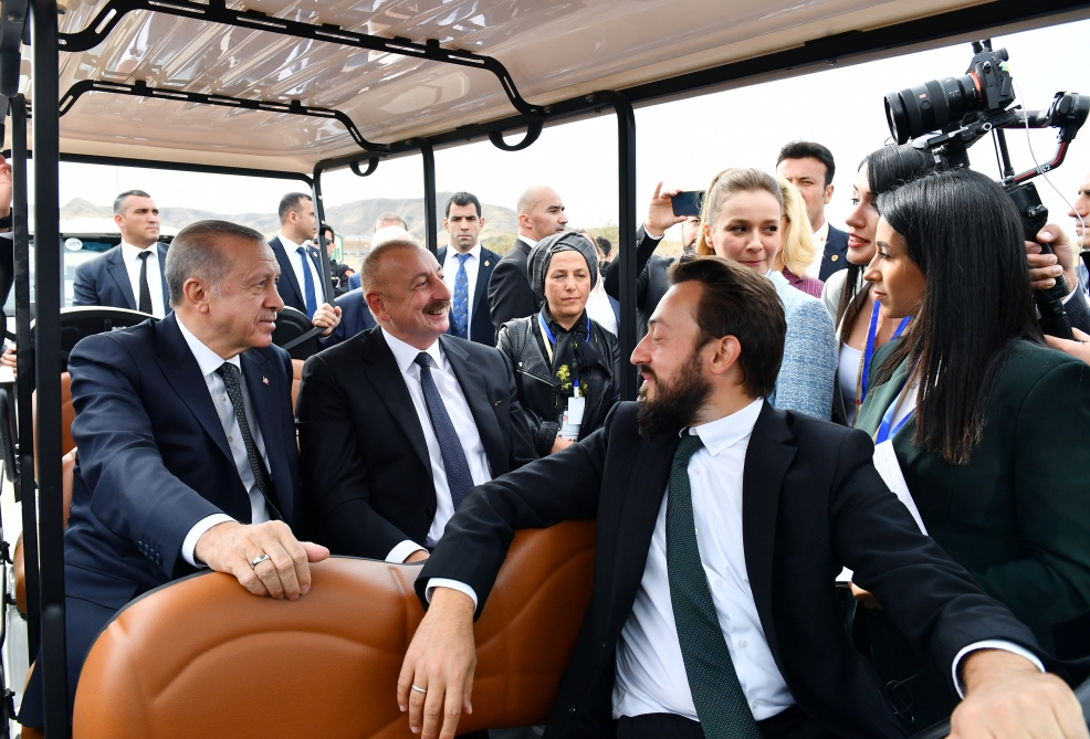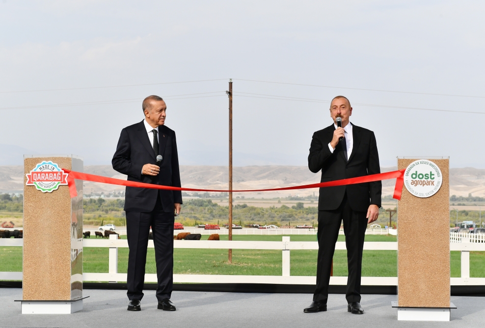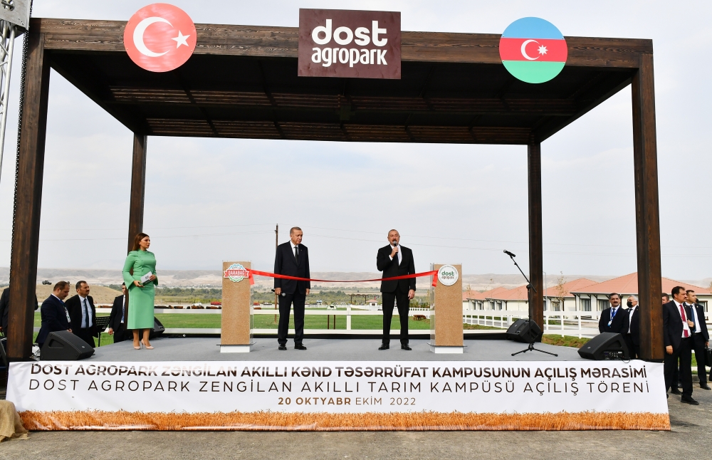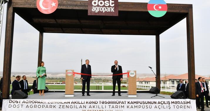Prezident İlham Əliyev və Türkiyə Prezidenti Rəcəb Tayyib Ərdoğan Zəngilan rayonunda “Dost Aqropark” ağıllı kənd təsərrüfatı kompleksinin birinci mərhələsinin açılışında iştirak ediblər.