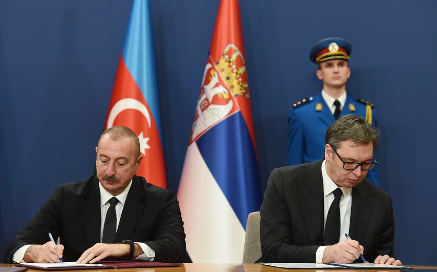 Teleqraf.com xəbər verir ki, Azərbaycan Respublikasının Prezidenti İlham Əliyev və Serbiya Respublikasının Prezidenti Aleksandar Vuçiç “Azərbaycan Respublikası Prezidenti ilə Serbiya Respublikası Prezidenti arasında Birgə Bəyanat”ı, “Azərbaycan Respublikası və Serbiya Respublikası arasında Strateji Tərəfdaşlıq Şurasının yaradılması haqqında Memorandum”u və onun əlavəsi olan “Azərbaycan Respublikası və Serbiya Respublikası arasında Strateji Tərəfdaşlıq Şurasının Əsasnaməsi”ni imzaladılar.