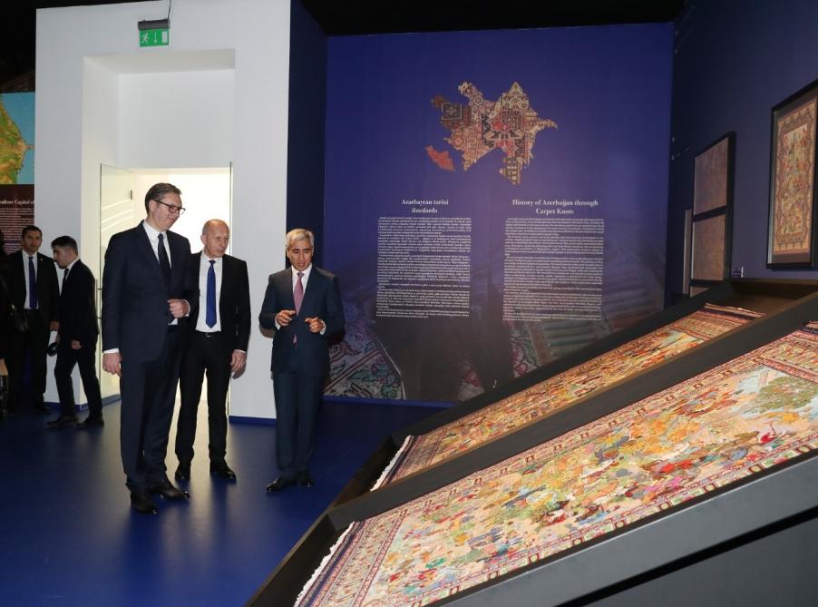 Aleksandar Vuçiç Mərkəzdə “Azərbaycan inciləri” sərgisi ilə də tanış olub. Bildirilib ki, Azərbaycanın tarixini və mədəniyyətini əks etdirən bu sərgidə ölkəmizin tükənməz təbii sərvətləri, çoxəsrlik tarixi, mədəni irsi ilə bağlı nadir eksponatlar nümayiş etdirilir. Burada qədim peşələrin, o cümlədən Azərbaycan xalçaçılıq məktəbinin nadir nümunələri sərgilənir, qədim çalğı alətlərimiz orijinal şəkildə - səsli formada təqdim olunur. Azərbaycan milli geyimlərinin, qədim sikkələrin nümayiş etdirildiyi sərgiyə gələnlər burada müxtəlif dillərdə müqəddəs kitabları da görə bilərlər.