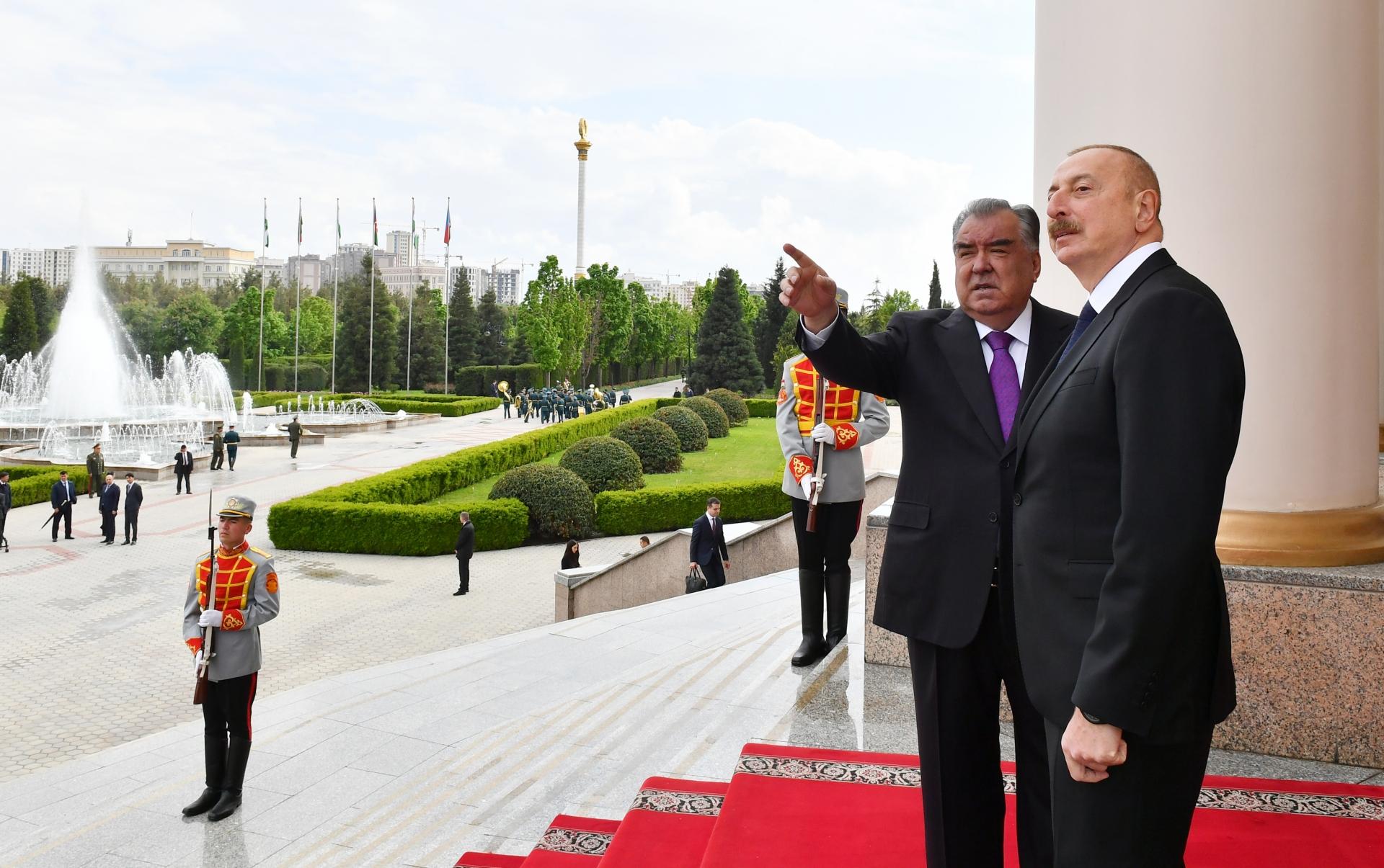 Teleqraf.com xəbər verir ki, Azərbaycanın və Tacikistanın Dövlət bayraqlarının dalğalandığı meydanda Prezident İlham Əliyevin şərəfinə fəxri qarovul dəstəsi düzülüb.