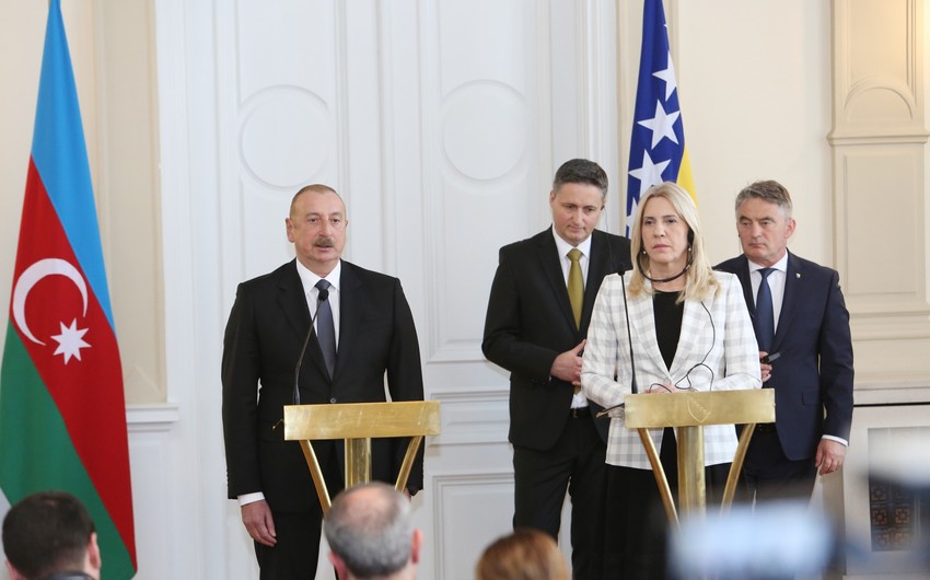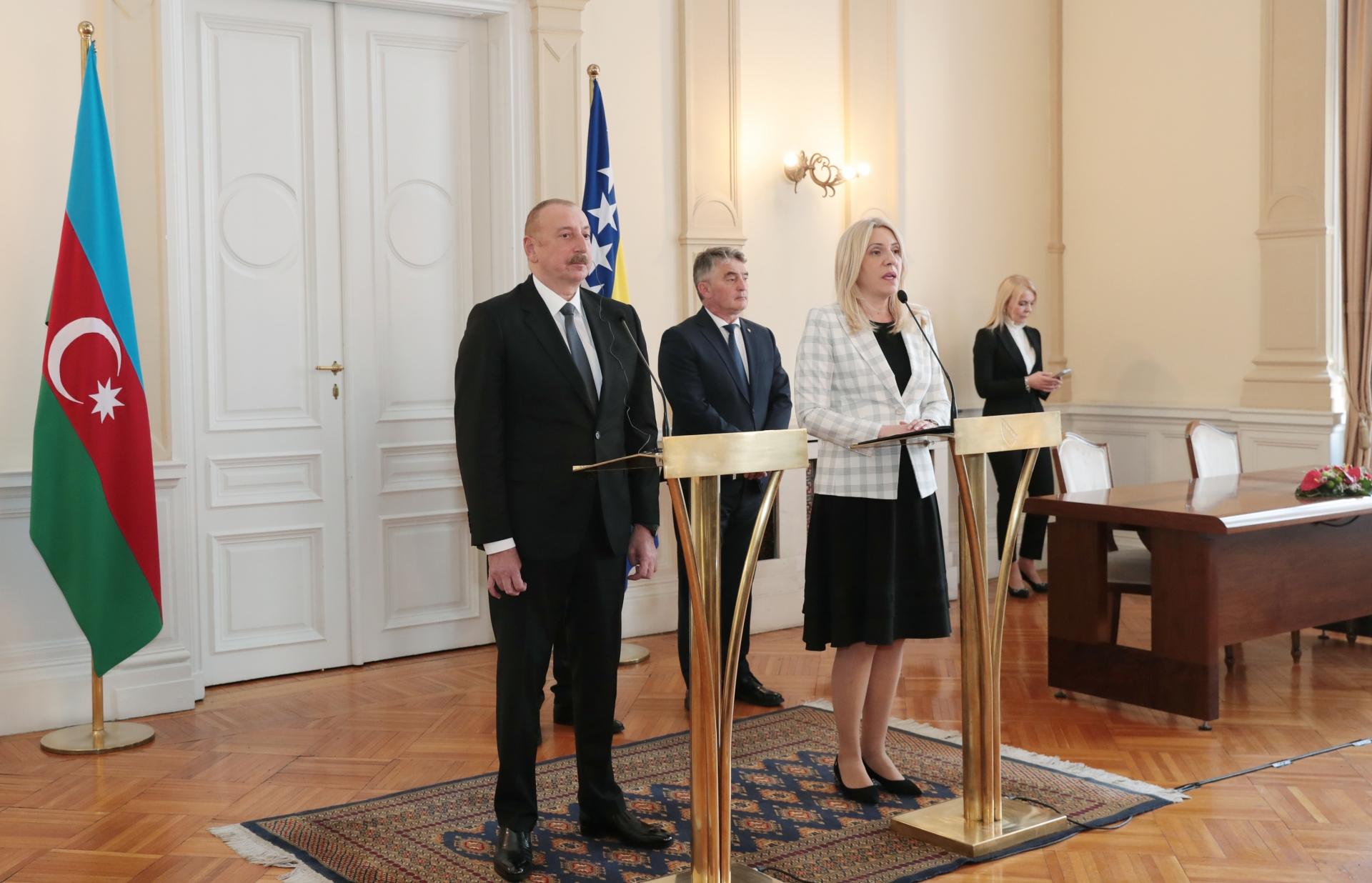 Bir məsələni də xüsusilə qeyd etmək istəyirəm, iki il yarım bundan əvvəl Azərbaycan İkinci Qarabağ müharibəsi zamanı öz ərazi bütövlüyünü bərpa edəndə Bosniya və Herseqovina qətiyyətli şəkildə Azərbaycanı dəstəkləmişdir, bizim haqq işimizi dəstəkləmişdir. Bu, dostluq və qardaşlıq mövqeyidir, buna görə biz Sizə minnətdarıq.