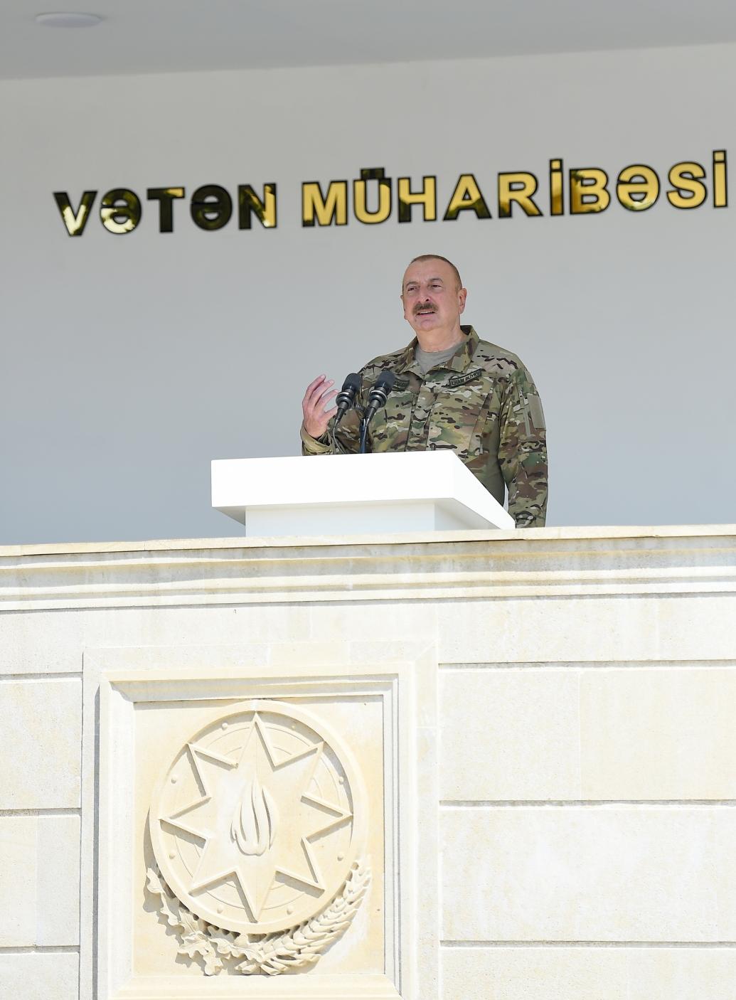 Bu gün biz öz şanlı Zəfərimizi siyasi və diplomatik müstəvidə daha da möhkəmləndirdik. Bu gün biz bölgədə söz sahibiyik. Bəziləri, o cümlədən Ermənistan və onun bəzi xarici himayədarları bizi qisasçılıqda ittiham edirlər. Tamamilə yalan bir tezisdir. Mən demişəm və müharibə dövründə demişəm ki, biz düşməndən qisasımızı döyüş meydanında alacağıq, şəhidlərimizin qanını döyüş meydanında alacağıq və belə də oldu. Azərbaycan Ordusu mülki əhaliyə qarşı müharibə aparmamışdır, bunu hər kəs bilir və görür. Ermənistandan fərqli olaraq onların şəhərlərini “İsgəndər”, “Toçka” və “Elbrus” raketləri ilə dağıtmamışıq. Azərbaycan Ordusu yüksək mənəvi xüsusiyyətlərə malikdir, Ali Baş Komandanın əmrlərini tam icra edir və icra edəcək. Ona görə bizi qisasçılıqda ittiham edənlər qoy gedib güzgüyə baxsınlar. Biz qisas yox, ədalət tələb edirik. Biz tələb edirik ki, haqq-ədalət qorunsun. Biz tələb edirik ki, bizim daxili işlərimizə heç kim müdaxilə etməsin. Biz tələb edirik ki, bütün ölkələr sözdə yox, əməldə bizim ərazi bütövlüyümüzə hörmətlə yanaşsın və belə olan halda biz də onların ərazi bütövlüyünə hörmətlə yanaşacağıq. Əks təqdirdə bizim də addımlarımız adekvat olacaq. Yenə də deyirəm, biz qisasımızı döyüş meydanında aldıq. Ancaq bununla bərabər, biz erməni vəhşiliklərini heç vaxt unutmamalıyıq. İşğal dövründə bizim şəhərlərimiz yerlə-yeksan edilmişdir. Tarixi abidələrimiz dağıdılmışdır. Bizim müqəddəs ocaqlarımız təhqir edilmiş və dağıdılmışdır. Bunu edən bizim mənfur qonşularımız idi. Buna göz yuman beynəlxalq aləm, beynəlxalq ictimaiyyət və indi hər gün Ermənistana baş çəkən rüşvətxor Avropa məmurları və deputatlarıdır. Onları bu ədalətsizliyə vadar edən nədir? İkili standartlar və rüşvət! Bunun başqa izahatı ola bilməz. Gedirlər, bizim sərhədimizə yaxın yerlərdə şəkillər çəkdirirlər, bizə hansısa mesajlar ünvanlayırlar. Hünərləri varsa gəlsin yaxınlaşsın bizim sərhədimizə. O vaxtlar artıq tarixdə qaldı. Yenə də onların ayağını biz qırdıq. Çünki İkinci Qarabağ müharibəsindən sonra biz bunu unutmamışıq. Bəzi Avropa ölkələrinin rəsmi nümayəndələri bizim ərazimizə, Xankəndiyə icazəsiz soxulmuşdular. Mən o vaxt demişdim ki, əgər bizim bundan xəbərimiz olsaydı, onları buraxmayacaqdıq. Bu gün də deyirəm, hünəriniz varsa gəlin, görək, sonra axırınız nə olacaq?
