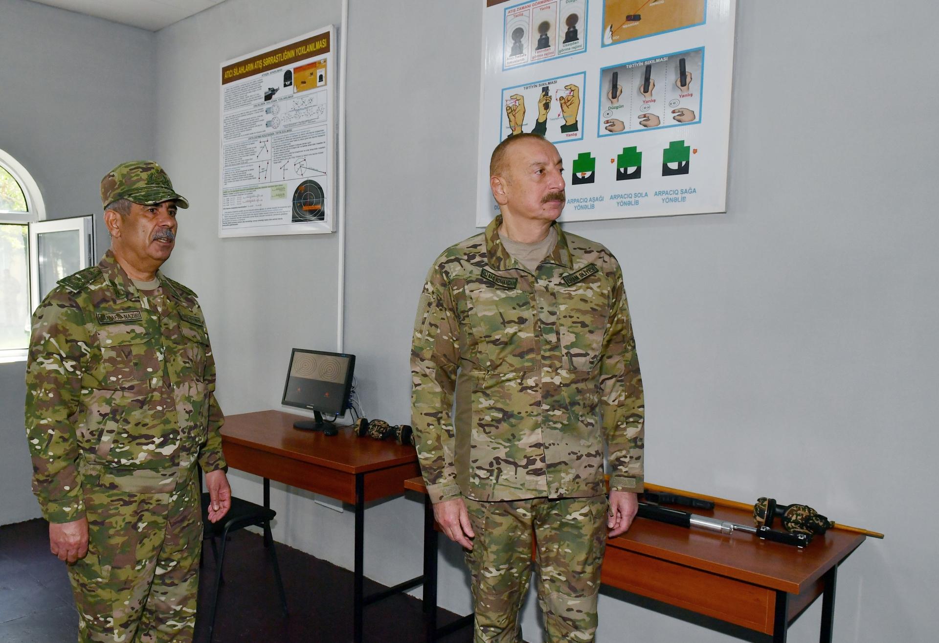 Sonra Prezident İlham Əliyev şəxsi heyətin atış vərdişlərini təkmilləşdirməsi üçün təyin olunmuş qapalı atış şəhərciyinə baxdı. Məruzə olundu ki, burada tapança, pnevmatik silah və kiçikçaplı tüfənglərdən atəş açmaq üçün nəzərdə tutulmuş 25 metr uzunluğunda iki atış zolağı, həmçinin atışın nəticələri əks olunan monitor mövcuddur.