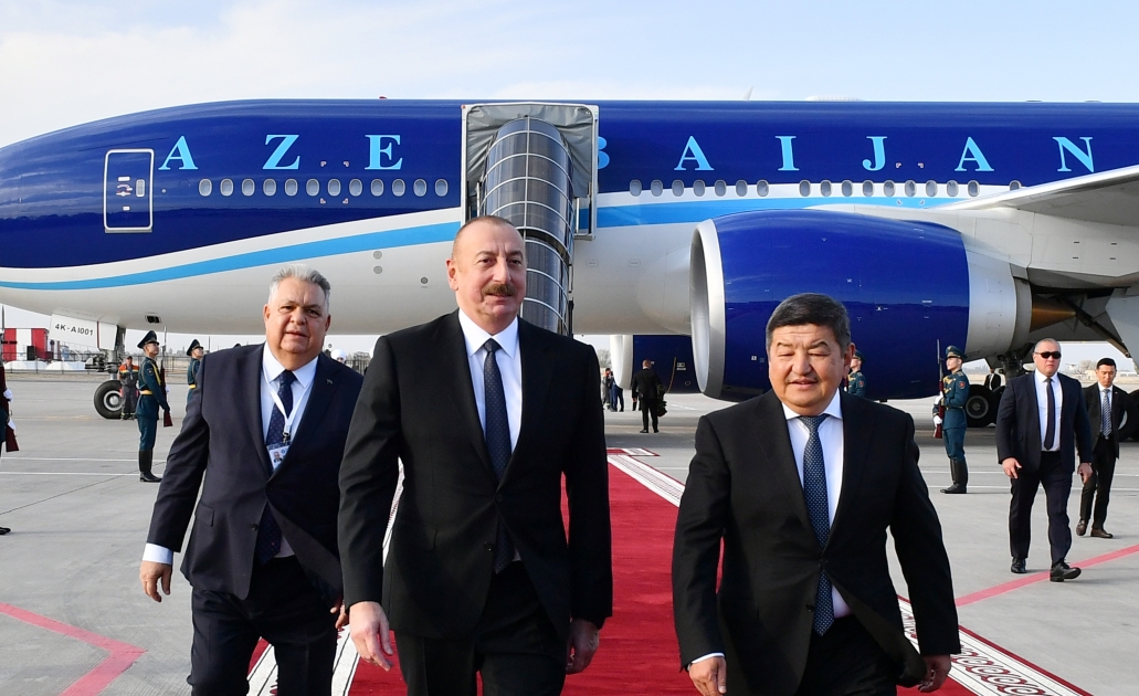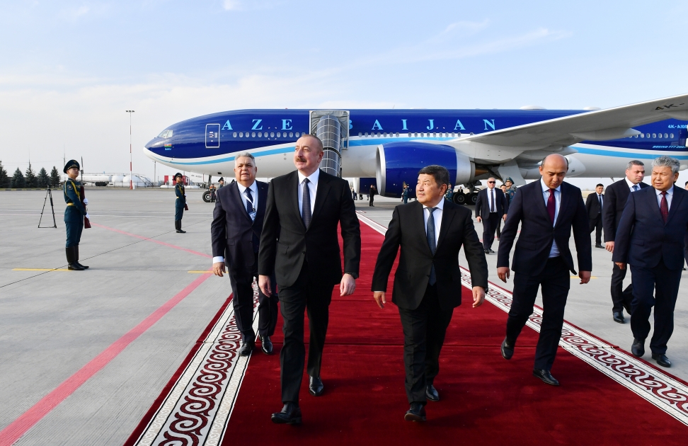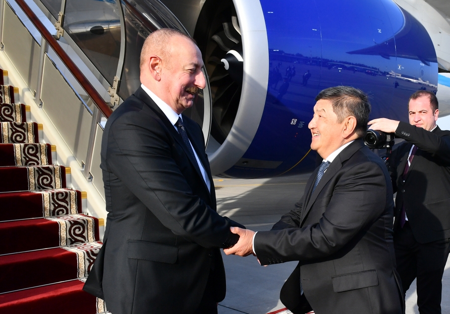 Azərbaycan Prezidentini Qırğızıstan Nazirlər Kabinetinin sədri - Prezident Administrasiyasının rəhbəri Akılbek Japarov və digər rəsmi şəxslər qarşılayıblar.