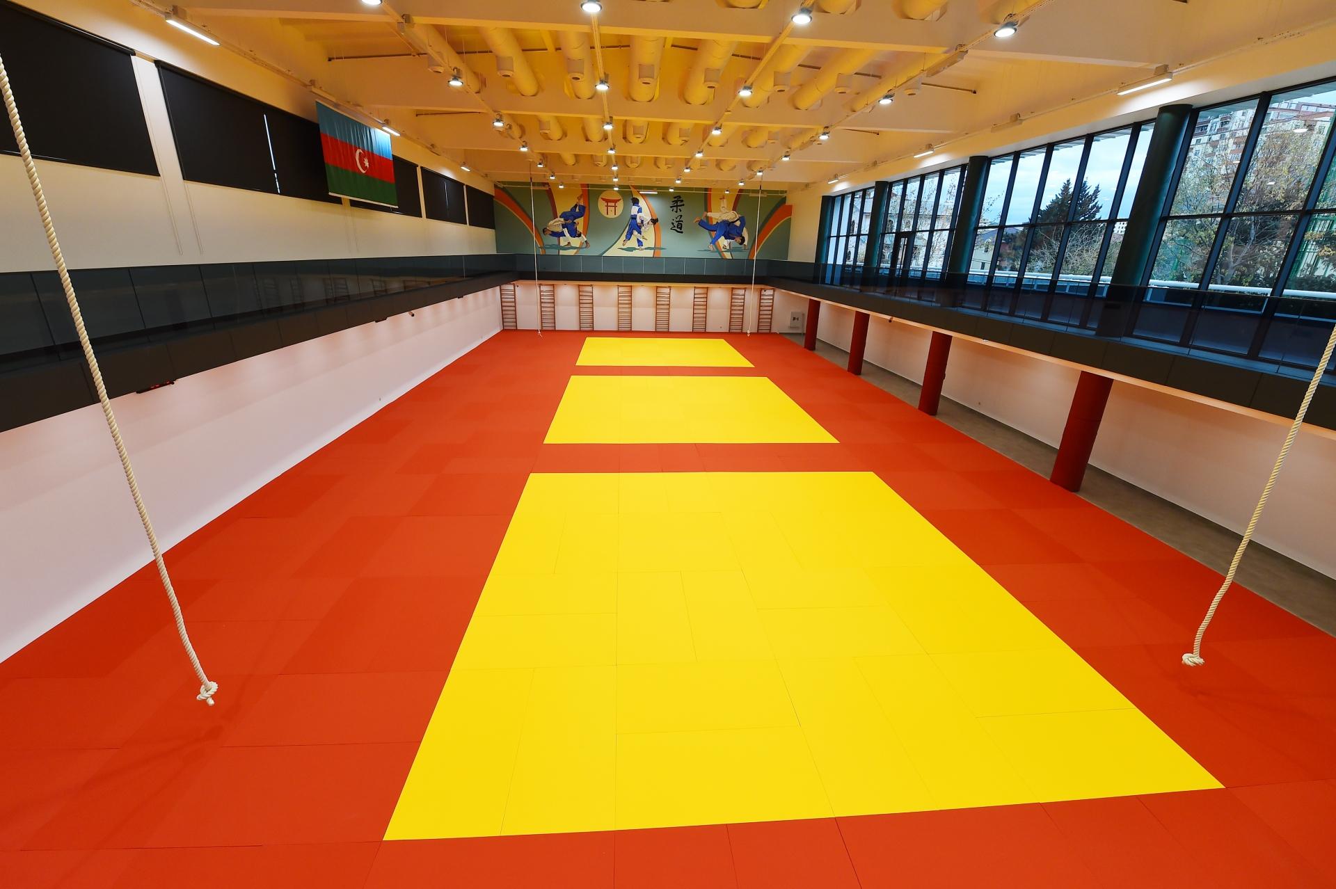 Burada kişilər və gənc oğlanlar üçün nəzərdə tutulan məşq zalında eyni vaxtda 100 idmançı məşq edə biləcək. Mərkəzdəki bütün məşq zalları Beynəlxalq Cüdo Federasiyasının standartlarına uyğun olan tatamilər ilə təchiz olunub. İdman qurğusunun fiziki hazırlıq zalı da ən yüksək standartlara cavab verir. Məşqçilərin otaqlarında da məhsuldar fəaliyyət üçün hər cür şərait yaradılıb.