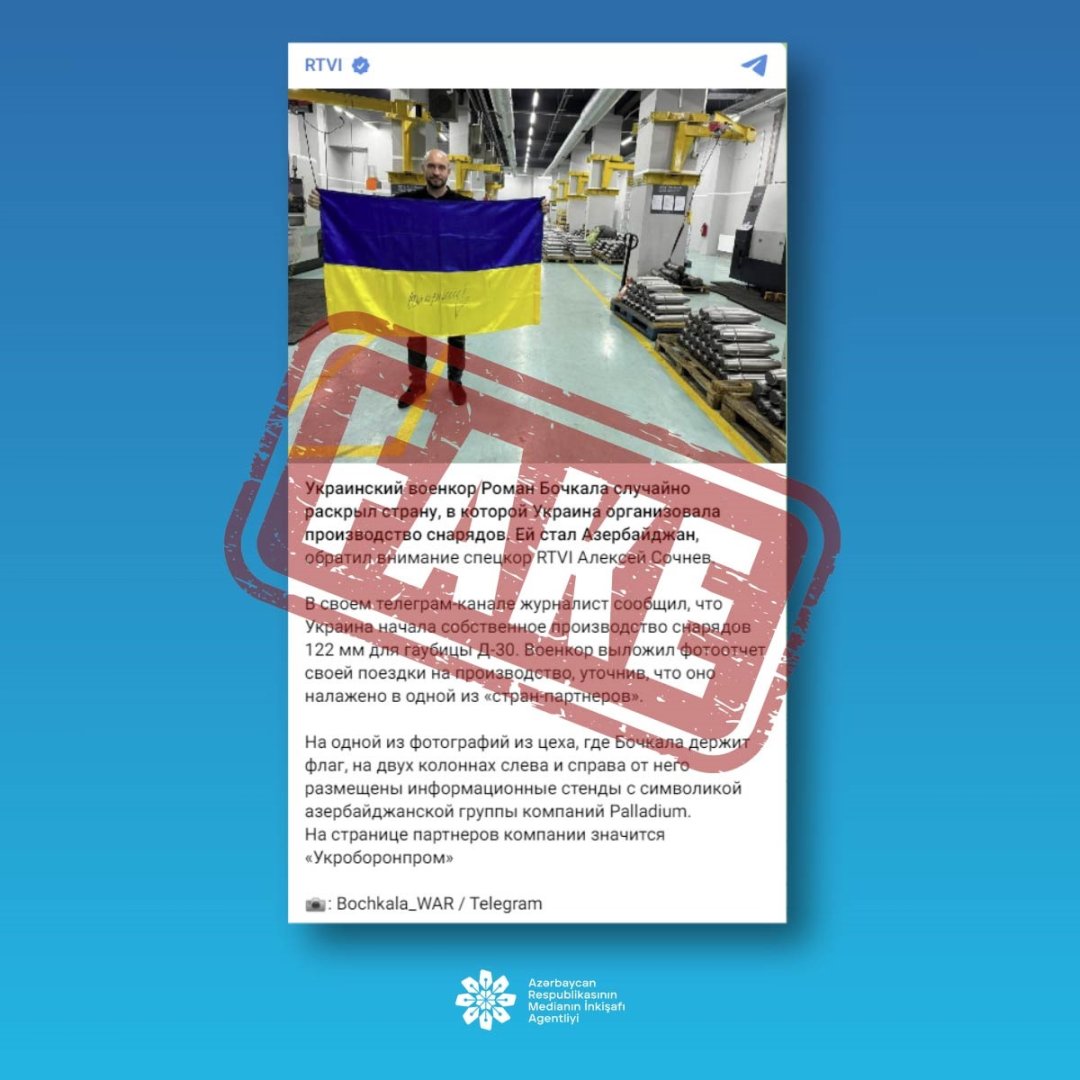 “Belə ki, Azərbaycan top mərmisi istehsal etmir və bu iddia sadəcə cəfəngiyyatdır. Azərbaycan humanizm prinsiplərini əsas götürərək Ukraynaya yalnız humanitar dəstək göstərir. Ukrayna bayrağı ilə jurnalist olduğu deyilən şəxsin çəkildiyi şəkilin Azərbaycanla heç bir əlaqəsi yoxdur. Medianın İnkişafı Agentliyi olaraq yerli və xarici sosial media istifadəçilərini bu kimi cəfəng xəbərlərə ehtiyat və həssaslıqla yanaşmağa çağırırıq”, - açıqlamada deyilir.
