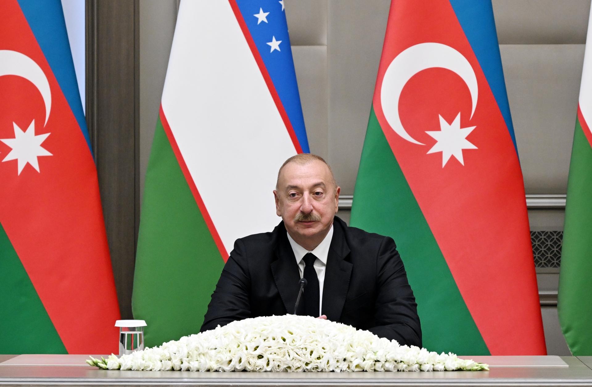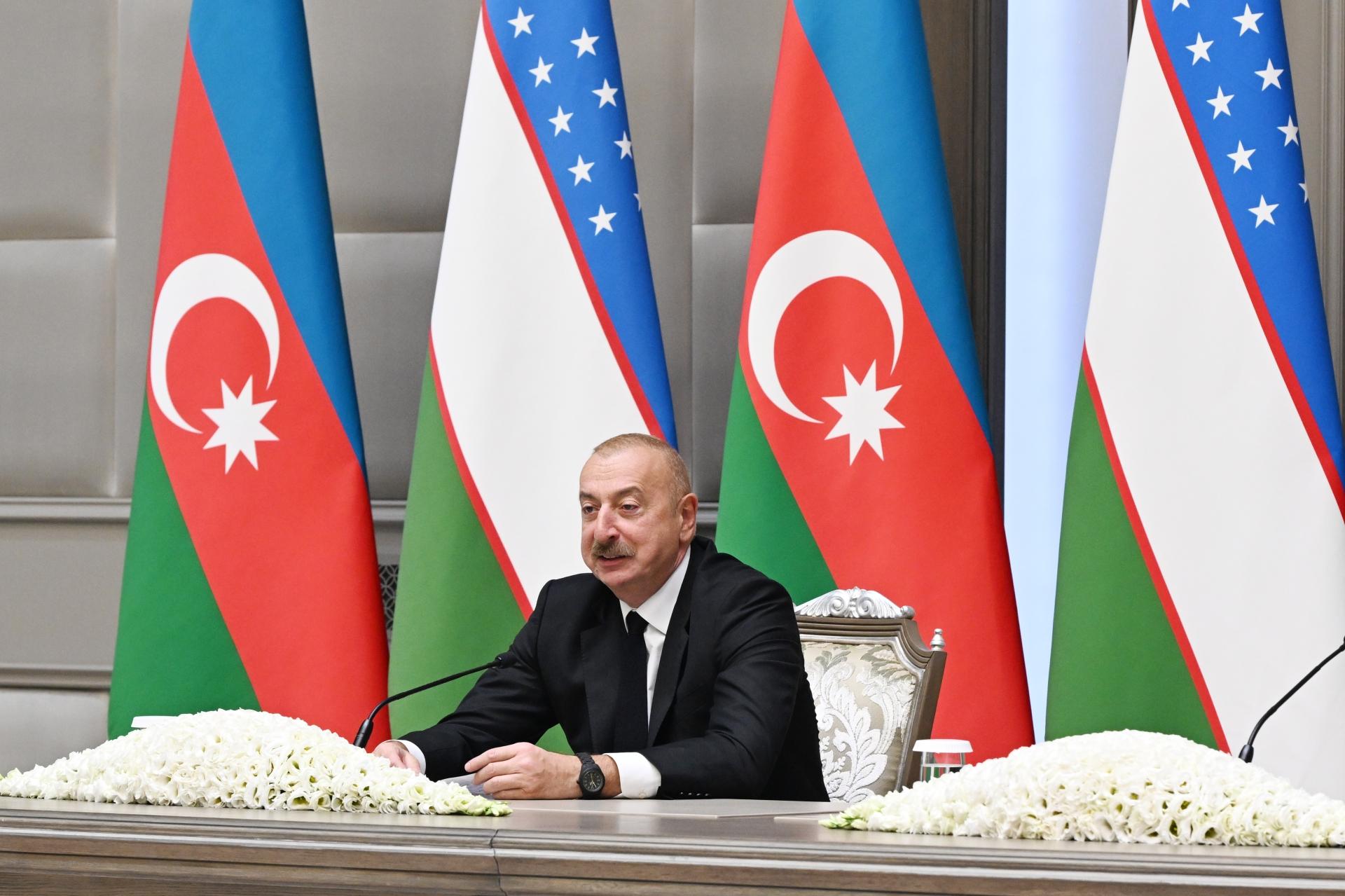 Hörmətli iştirakçılar, siz yəqin ki, bu gün bizim, əslində, nə etdiyimizi sonuna qədər təsəvvür etmirsiniz... Zənnimcə, bu il 33 iliyimizin tamam olduğu qısa bir müddətdə bu sənədlərin imzalanması heç bir ölkə ilə olmayıb, birincisi, Özbəkistanın çox az ölkə ilə müttəfiqlik münasibətləri var. Sizin qarşınızda bir daha demək istəyirəm, bu gün biz tarix yazdıq. Bu tarix iki yaxın xalqın - Azərbaycan və Özbəkistan xalqlarının rifahında öz əksini tapacaq. Bu münasibətlə Sizi bir daha təbrik edirəm.