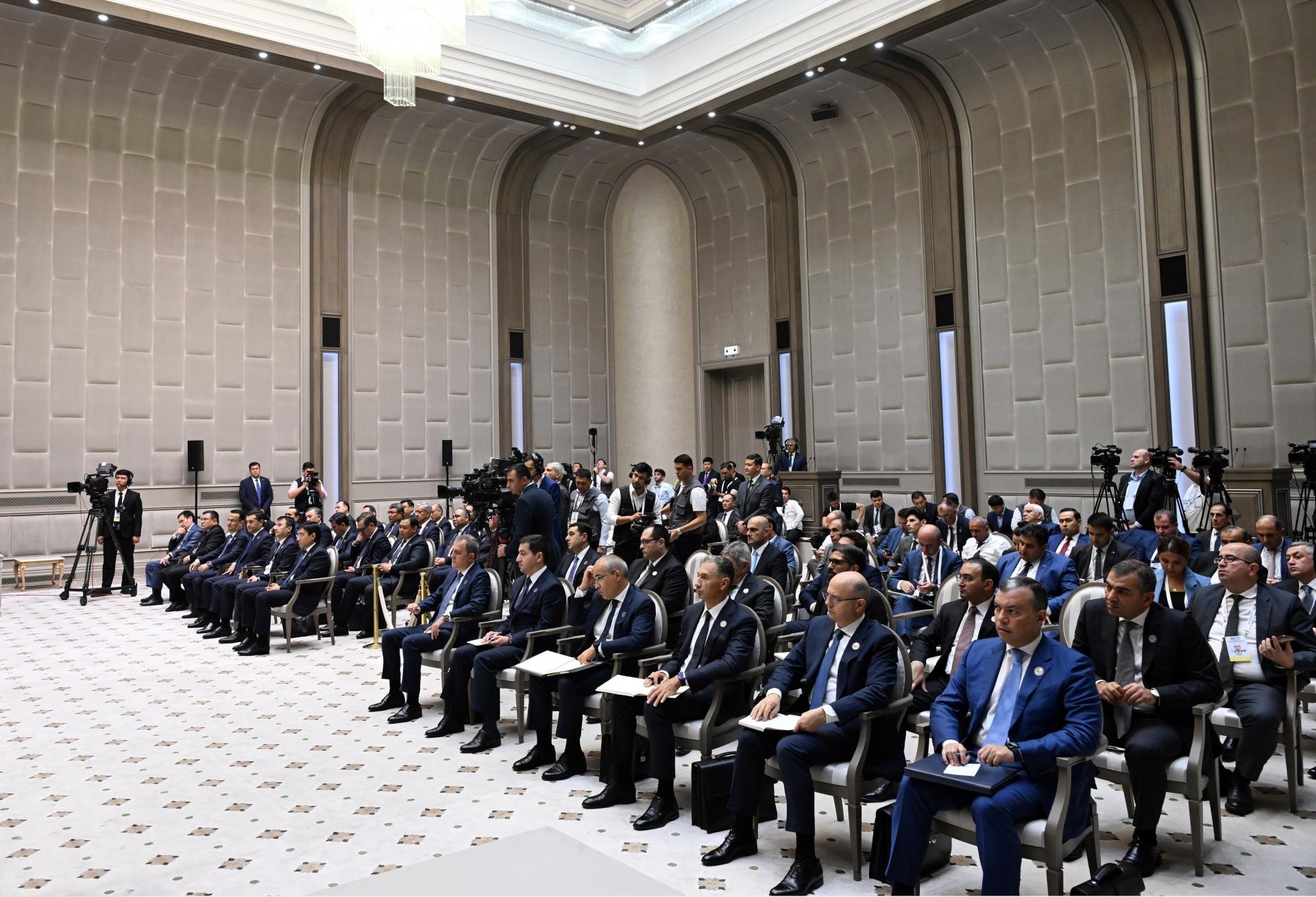 -Hörmətli kütləvi informasiya vasitələrinin nümayəndələri. Sizin iştirakınıza şadam. Azərbaycan Respublikasının Prezidentini, əziz qardaşım, hörmətli İlham Heydər oğlu Əliyevi və Azərbaycan nümayəndə heyətinin bütün üzvlərini qonaqpərvər özbək torpağında səmimiyyətlə salamlayıram. Sizi görməyimizə çox şadıq. Özbəkistana xoş gəlmisiniz.