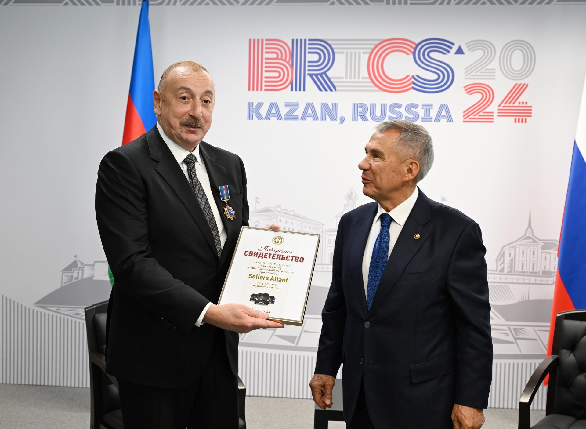 Azərbaycan Prezidentinin Tatarıstanın ali dövlət mükafatı ilə təltif olunması haqqında Fərman oxundu: “Tatarıstan Respublikası Rəisinin Fərmanı ilə Tatarıstan Respublikası ilə Azərbaycan Respublikası arasında əməkdaşlığın inkişafına, xalqlar arasında dostluq və qarşılıqlı anlaşmanın möhkəmləndirilməsinə töhfəsinə görə Prezident İlham Əliyev “Dostluq” ordeni ilə təltif olunur”.