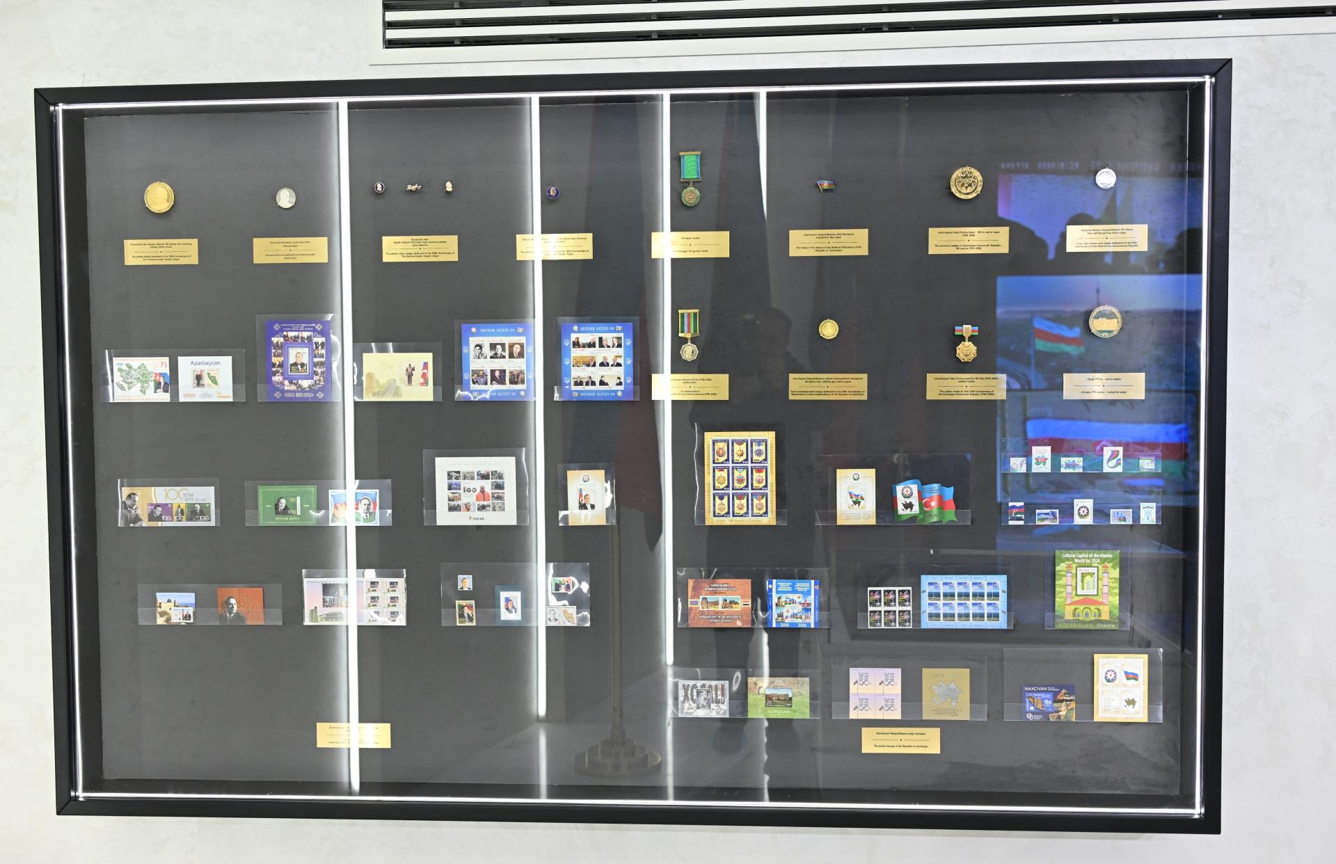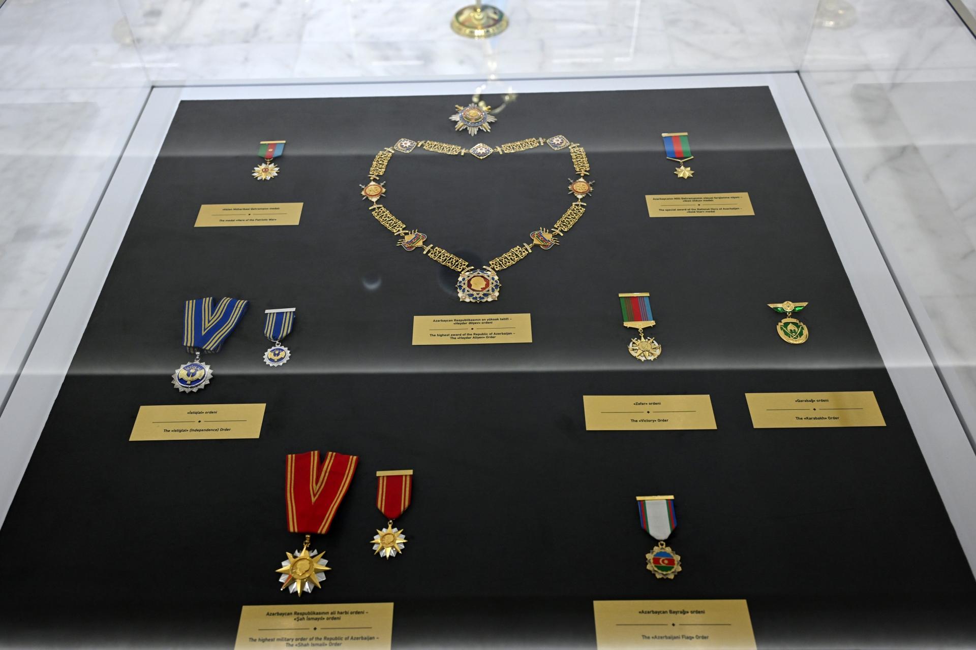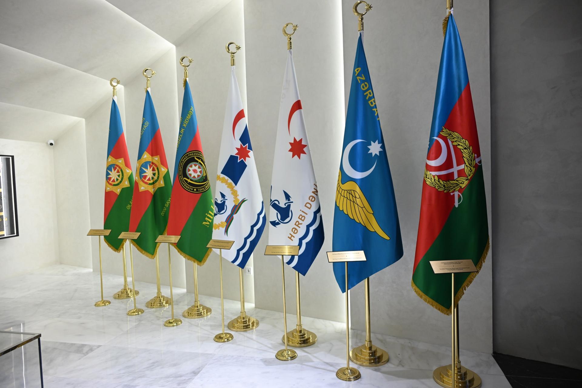 Azərbaycan Silahlı Qüvvələrinin bayraqları, medalları, emblem və şevronları isə muzeyin D salonunda sərgilənir.