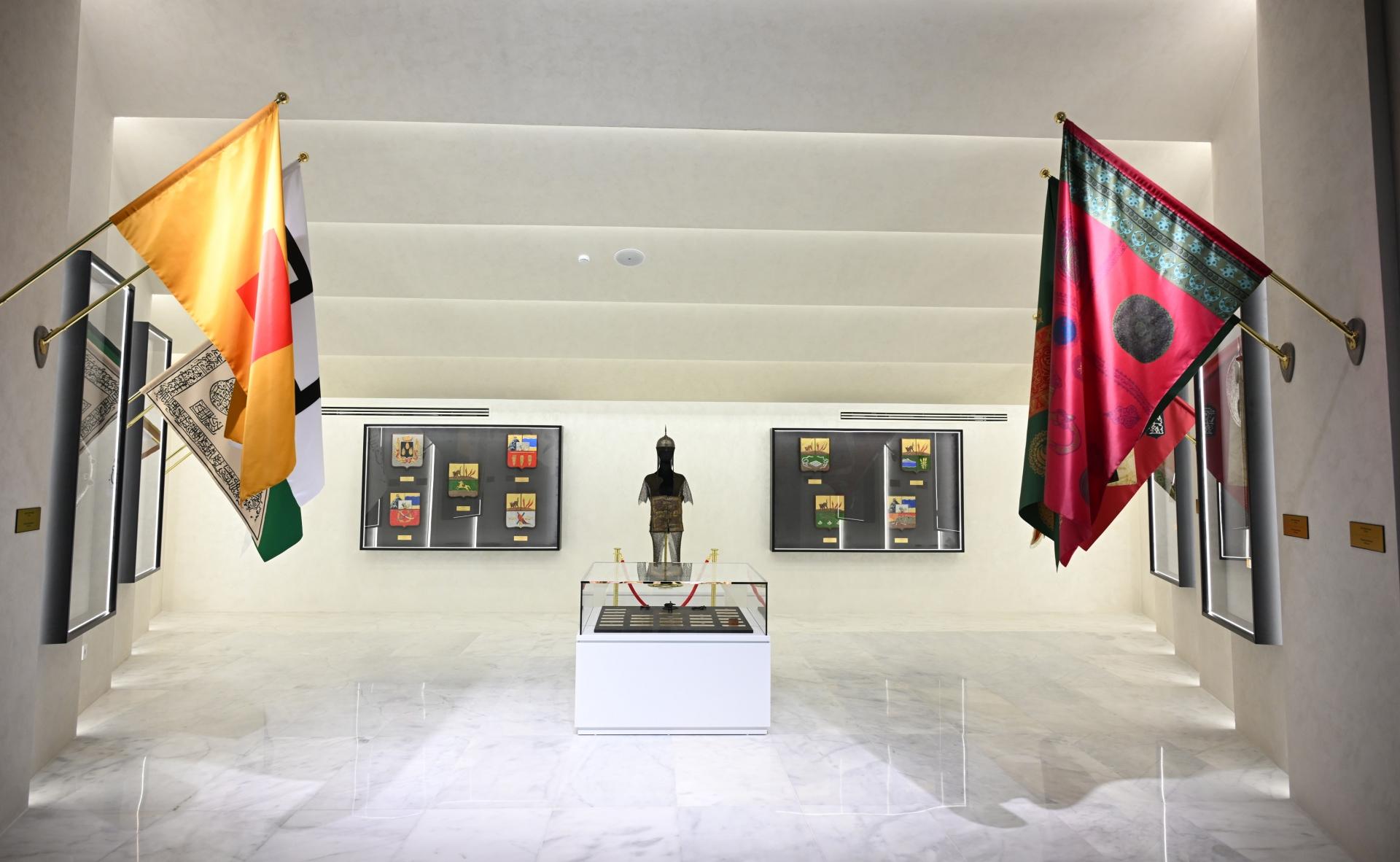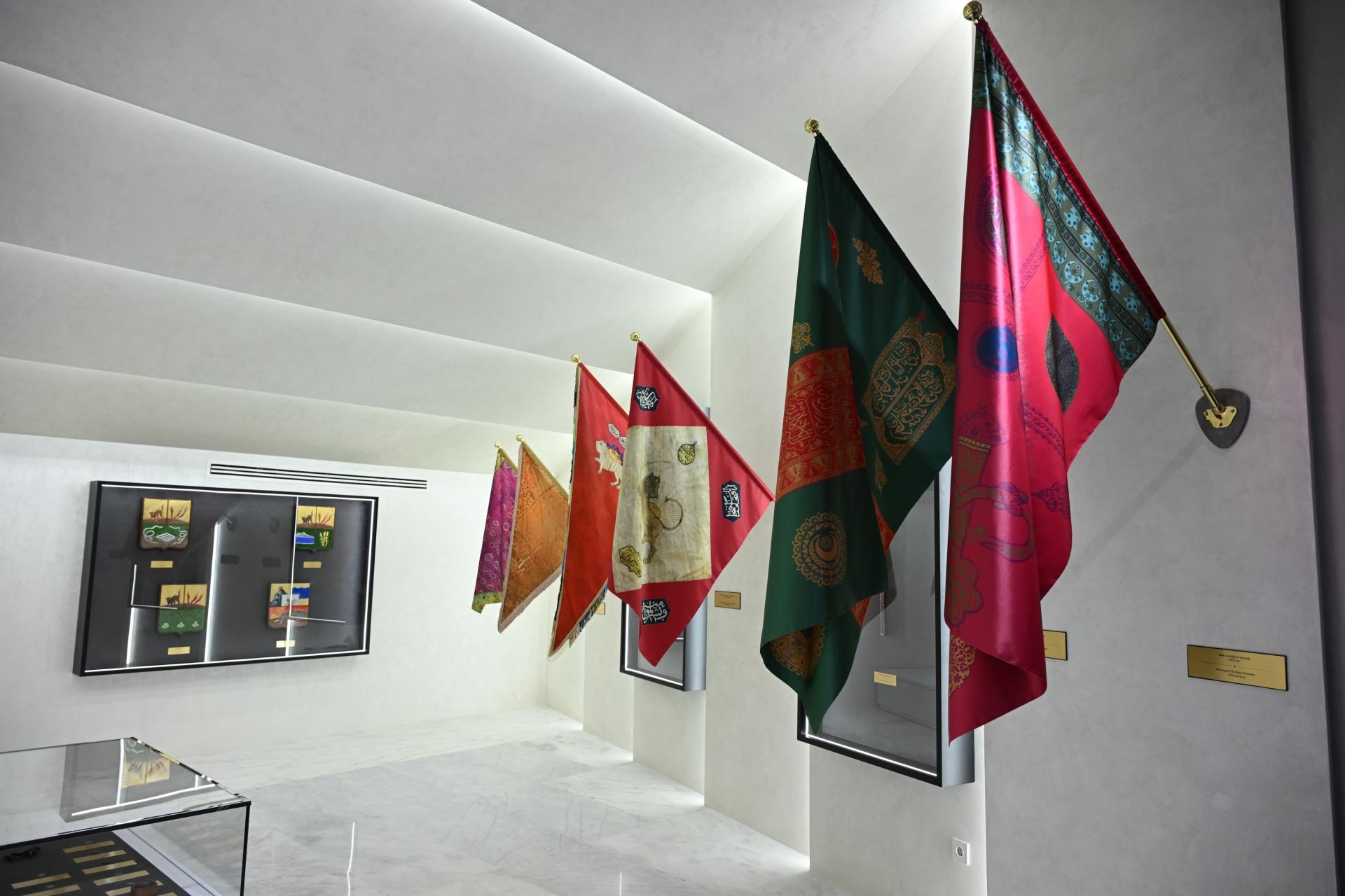 A Sərgi salonunda ölkəmizin qədim və orta əsrlər dövrünə aid bayraqlar, bayraq ucluqları, hakimiyyət rəmzləri, sikkələr, silahlar və XIX əsr Azərbaycan şəhərlərinin gerbləri nümayiş olunur.