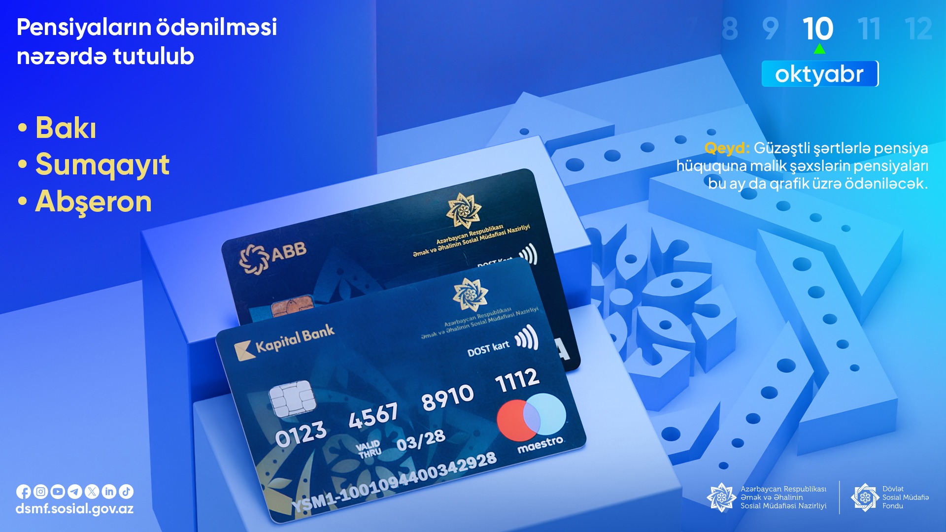 Sabah Bakı və Sumqayıt şəhərləri, eləcə də Abşeron rayonu üzrə bu ayın pensiyalarının ödənilməsi nəzərdə tutulub.