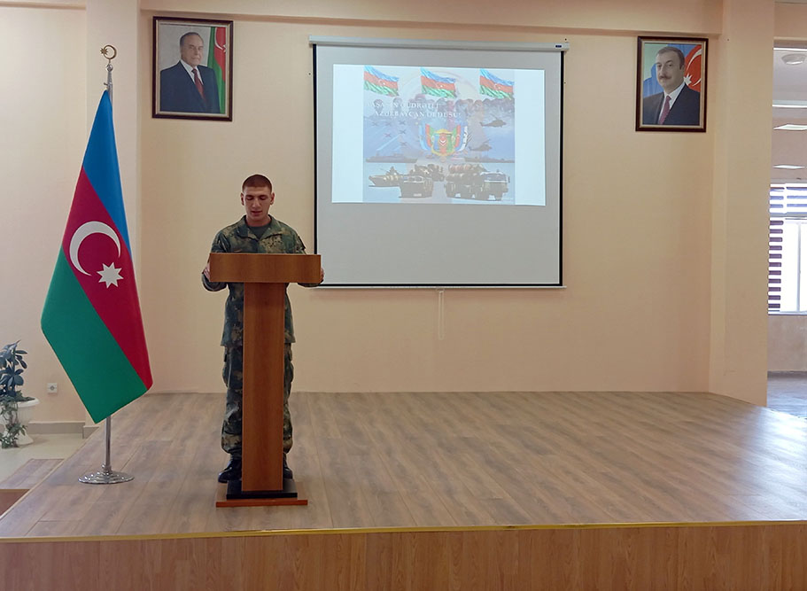 Tədbirlərdə Müdafiə Nazirliyinin nümayəndələri və hərbi hissə komandirləri çıxış edərək andiçmə mərasiminin 10 May tarixinə - Xalqımızın Ümummilli Lideri Heydər Əliyevin anadan olmasının 102 illiyinə təsadüf etməsini xüsusi vurğulayaraq, Ulu Öndərin şərəfli ömür yolu və çoxşaxəli fəaliyyətindən, xalqımız və dövlətçiliyimiz üçün gördüyü əvəzsiz xidmətlərdən danışıb, gənc əsgərləri əlamətdar gün münasibətilə təbrik edib, onlara Vətənə, dövlətə və Ali Baş Komandana, hərbi anda sadiq olmalarını, nümunəvi xidmət etməyi, silah və texnikanın sirlərini dərindən öyrənərək döyüş hazırlıqlarını daim yüksəltmələrini, komandir-rəis heyətinin əmr və göstərişlərini dəqiq və vaxtında yerinə yetirmələrini, torpaqlarımızın müdafiəsi naminə hər an hazır olmalarını tövsiyə ediblər.