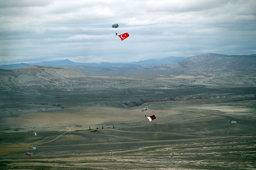 Təlimin yekununda iştirakçı ölkələrin bayraqları ilə paraşüt tullanışları həyata keçirilib.