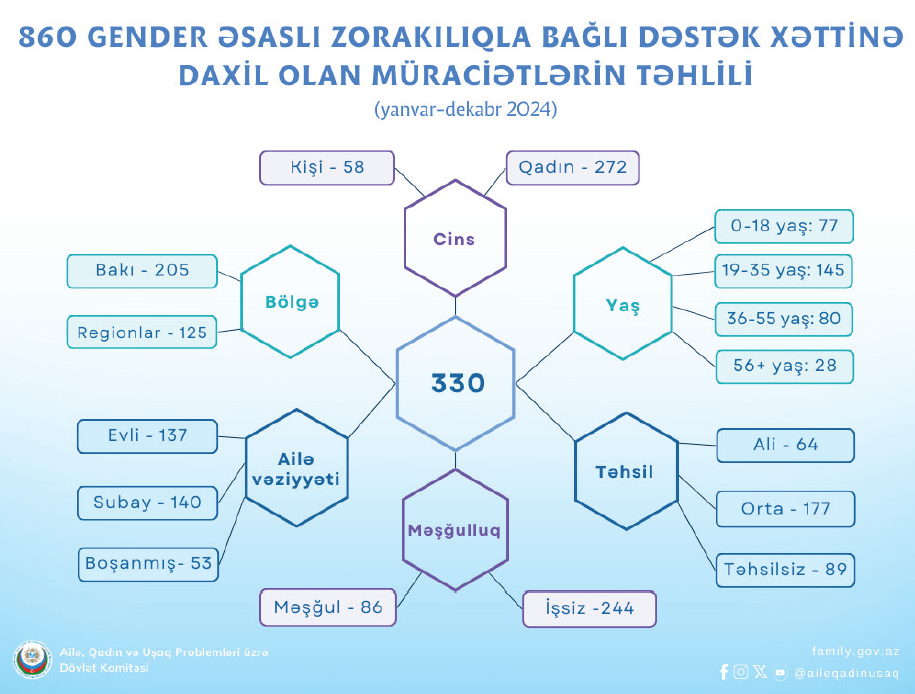 Zorakılığa məruz qalmaları ilə bağlı müraciət edənlərdən 272 nəfəri qadın, 58 nəfəri isə kişilərdir. Onlar Dövlət Komitəsindən dəstək istəyiblər.