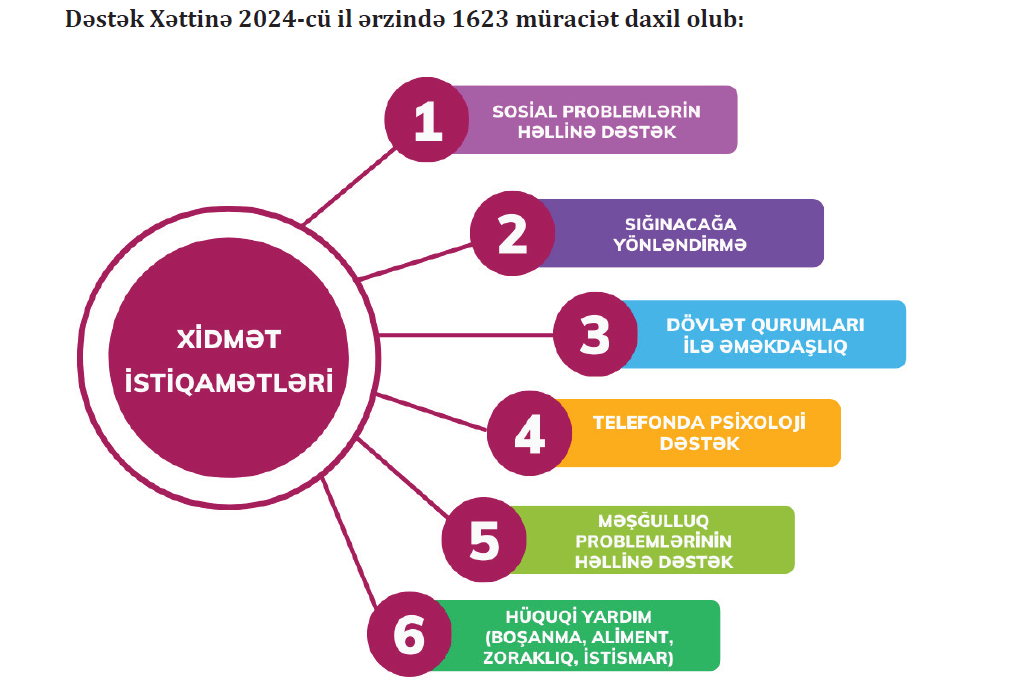 Ümumilikdə isə dəstək xidmətinə 1 623 müraciət olub ki, bunlar da 6 istiqaməti əhatə edib. Xidmət istiqamətləri sosial problemlərin həllinə dəstək, sığınacağa yönləndirmə, dövlət qurumları ilə əməkdaşlıq, telefonda psixoloji dəstək, məşğulluq problemlərinin həllinə dəstək və hüquqi yardım olub.