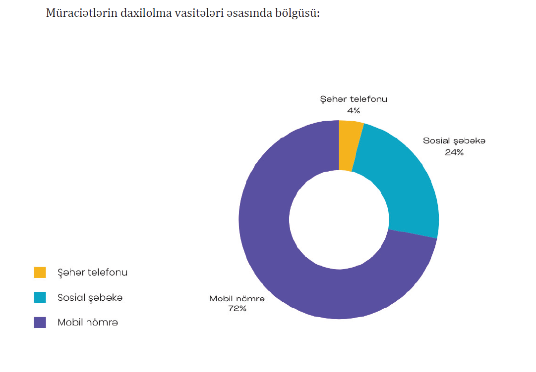 Bundan başqa, müraciətlərin 24%-i sosial şəbəkələr üzərindən olub. 4 faiz şəhər telefonları, 72 faiz isə mobil nömrələrlə müraciət edib.