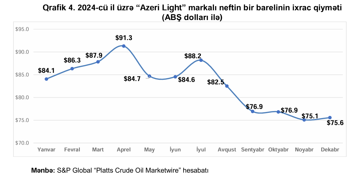 “Azeri Light” markalı neftin bir barelinin orta illik qiyməti 82,8 ABŞ dolları səviyyəsində qərarlaşmış, 2023-cü ildəki orta qiymətdən 3,8 faiz az, 2024-cü ilin dövlət büdcəsi üzrə əsas götürülmüş göstəricidən (75,0 ABŞ dolları) 10,4 faiz çox olub.