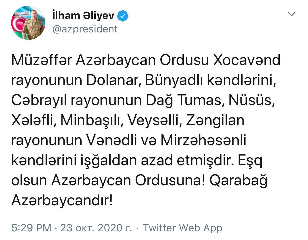 "Müzəffər Azərbaycan Ordusu Xocavənd rayonunun Dolanlar, Bünyadlı kəndlərini, Cəbrayıl rayonunun Dağ Tumas, Nüsüs, Xələfli, Minbaşılı, Veysəlli, Zəngilan rayonunun Vənədli və Mirzəhəsənli kəndlərini işğaldan azad etmişdir. Eşq olsun Azərbaycan Ordusuna! Qarabağ Azərbaycandır!"